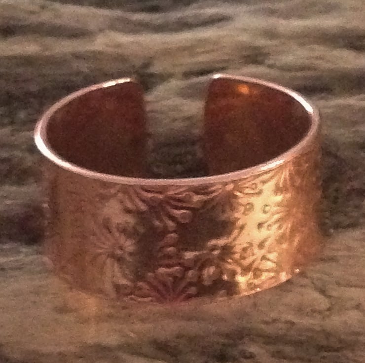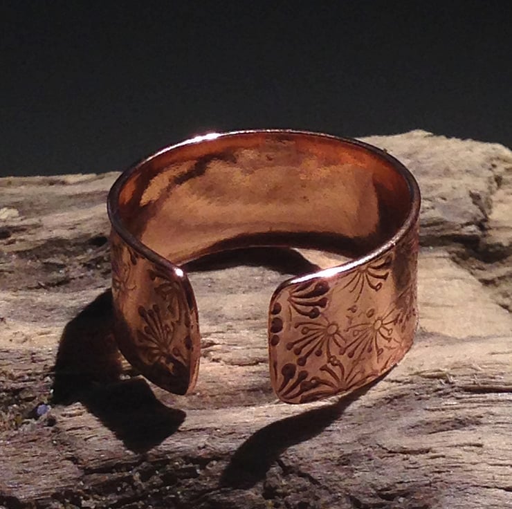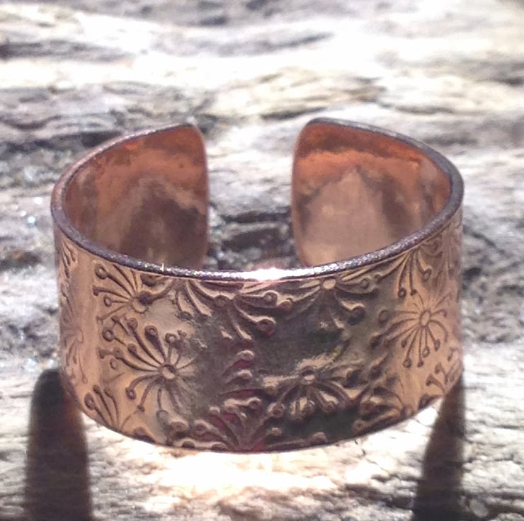 This beautiful ring is hand forged from sheet copper. It has been given an attractive organic stamped design and polished to a high shine.