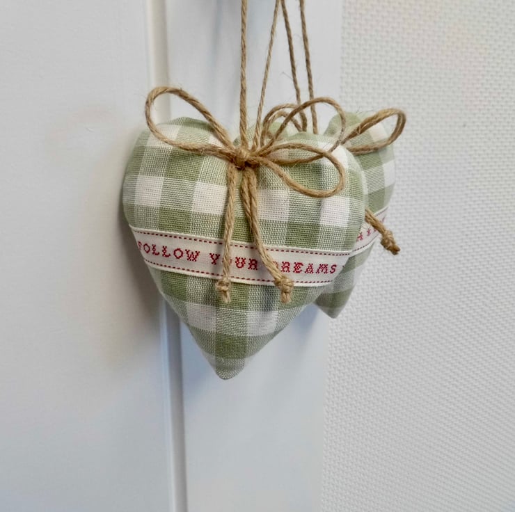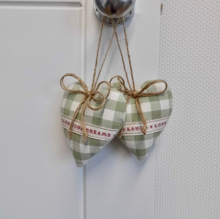A duo of padded heart-shaped door hangers carefully made using Laura Ashley's beautiful gingham in heath green.