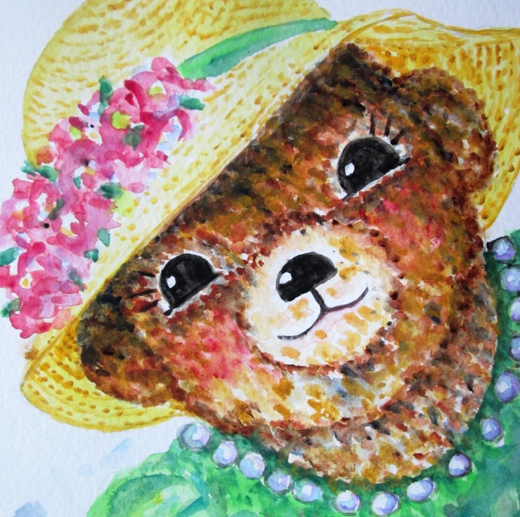A cute teddy bear girl in a hat with pink flowers. Great gift idea for children.