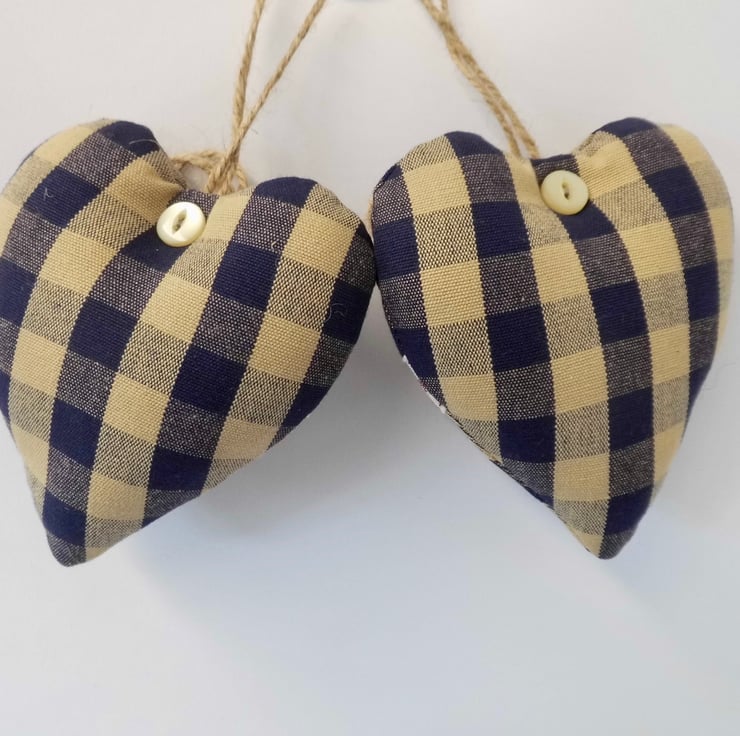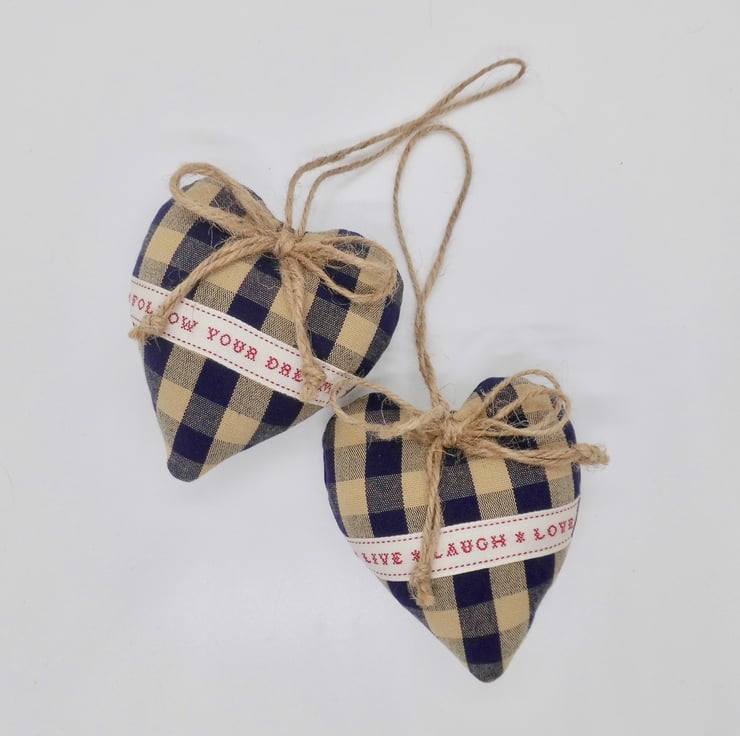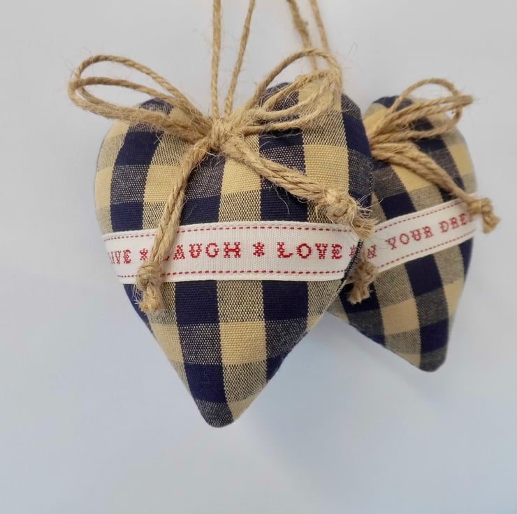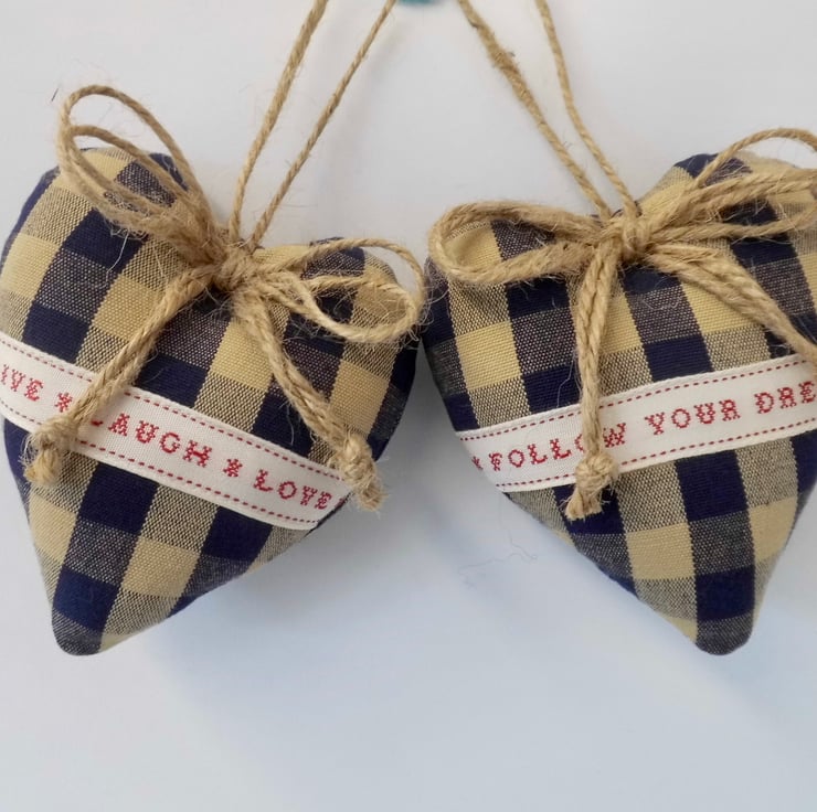 A duo of padded heart-shaped door hangers carefully made using a navy and beige woven check fabric. They have been decorated with East of India ribbon, one saying "Follow your dreams, the other saying "Live, laugh, love".