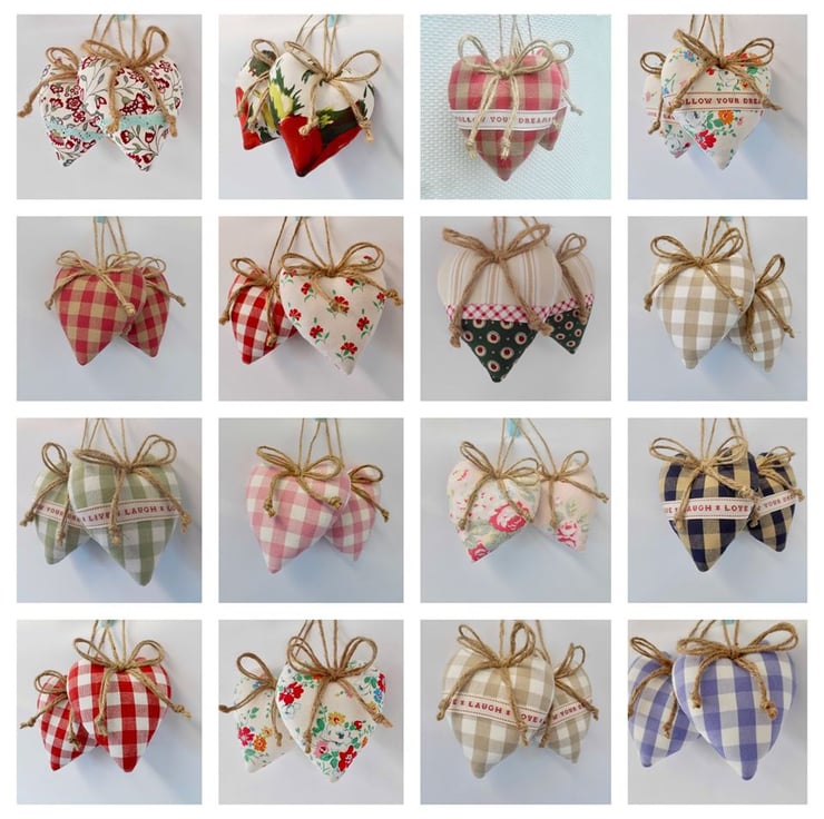 Hanging on a loop of natural jute twine with a double bow and finished at the back with a little button for neatness. Each heart measures approximately 11cm x 12cm. The loop of twine has a drop of 13cm.