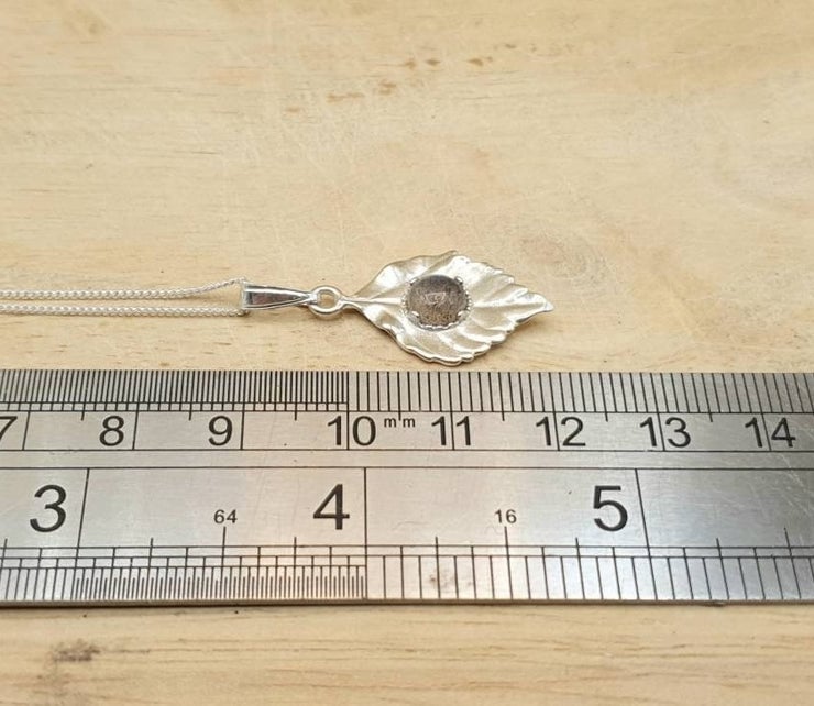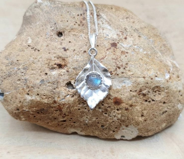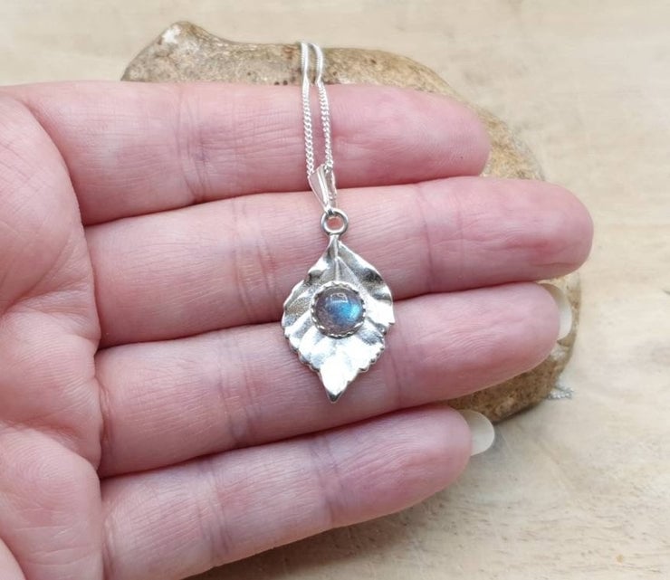 This is a women's tiny, delicate sterling silver flower Labradorite pendant necklace.