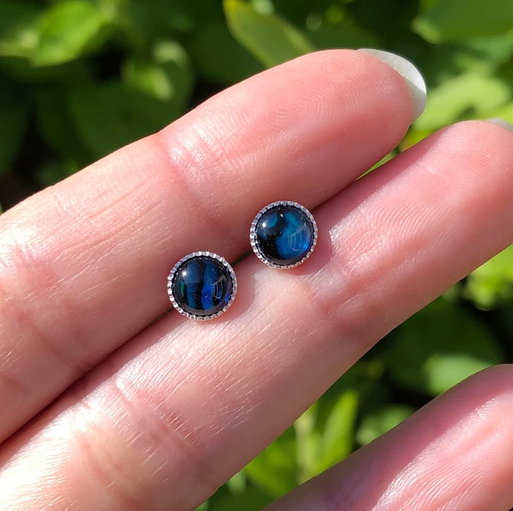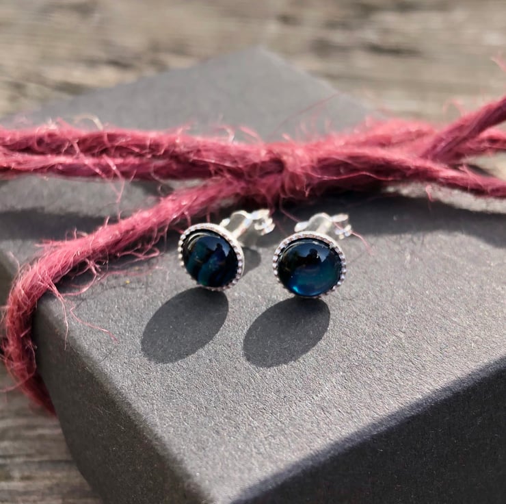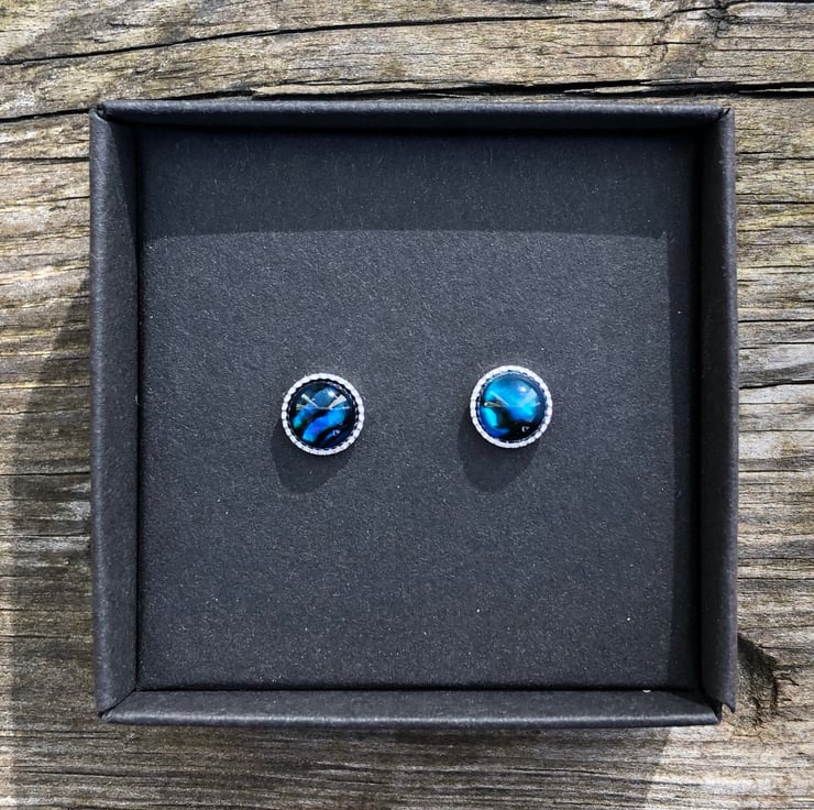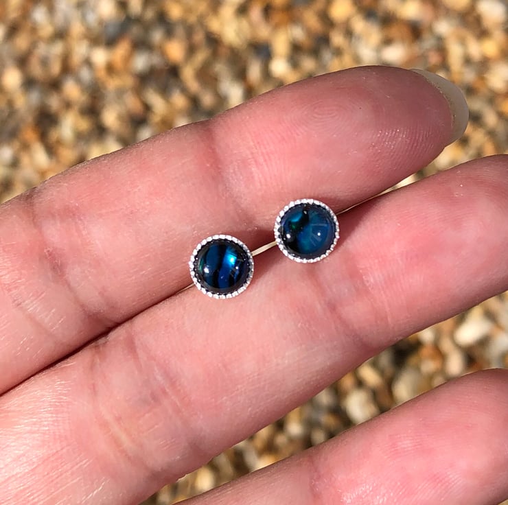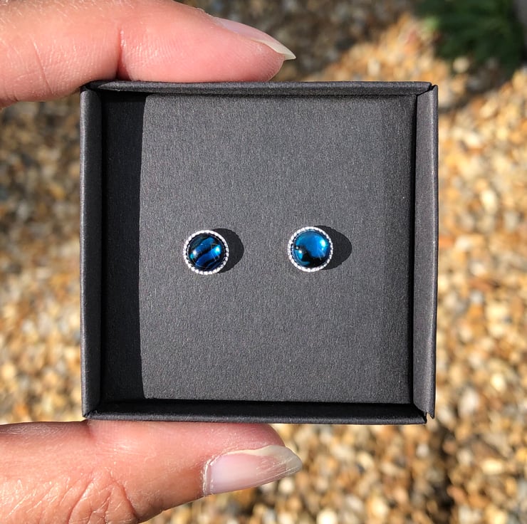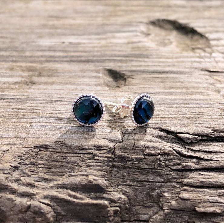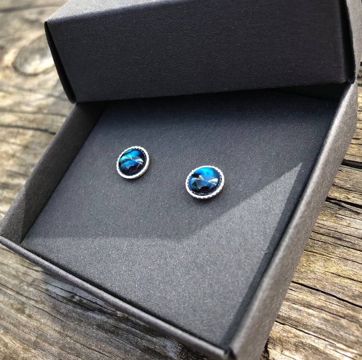 These stunning blue abalone shell cabochons which measure 6mm have been set in elegant milled edge sterling silver settings making the most delightful stud earrings.