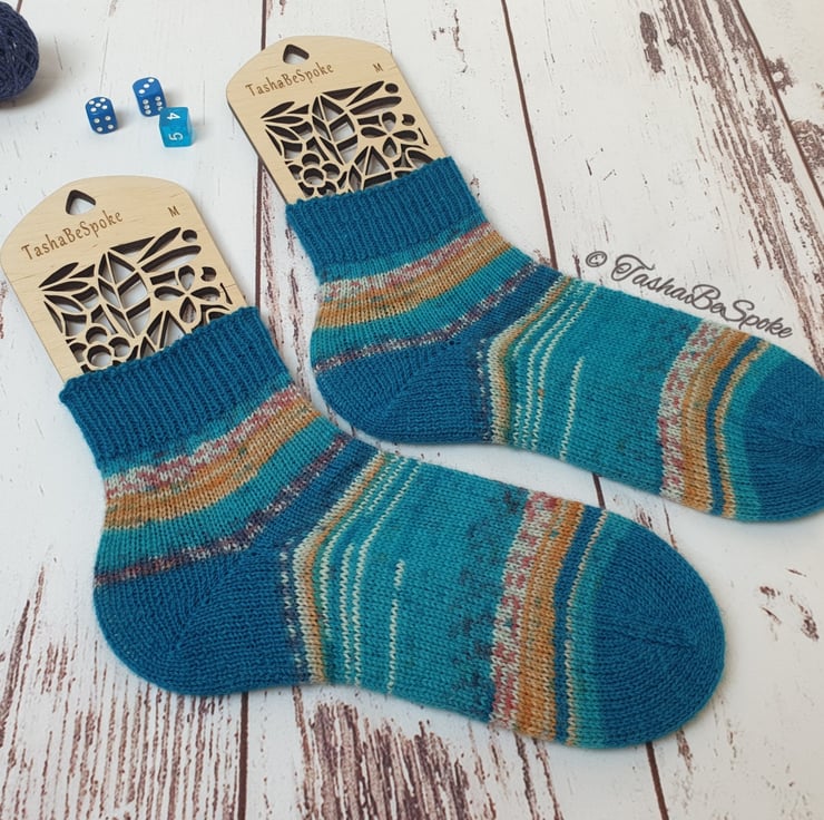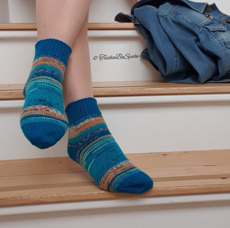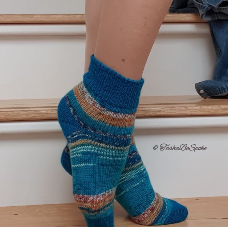Pictured socks are made in 2 colours: 105 - Turquoise ( toe, heel and cuff parts of the sock ) and 162 - Blue Sea Print ( foot and leg parts of the sock) in SIZE M and they are READY to ship ( Model shoes size UK 5.5 - 6 ).