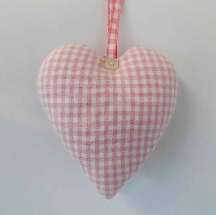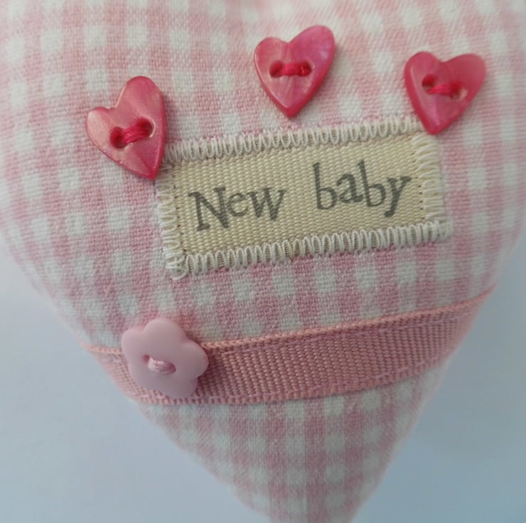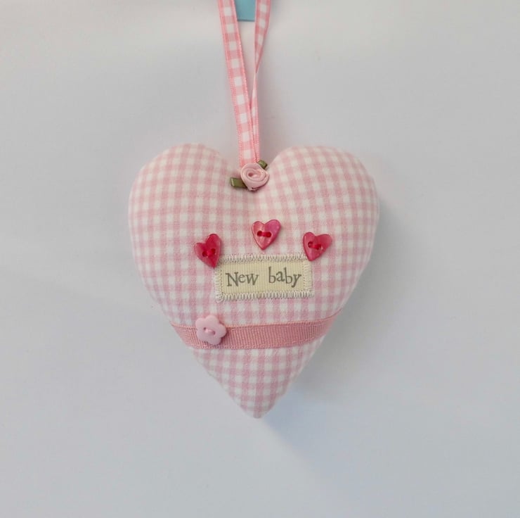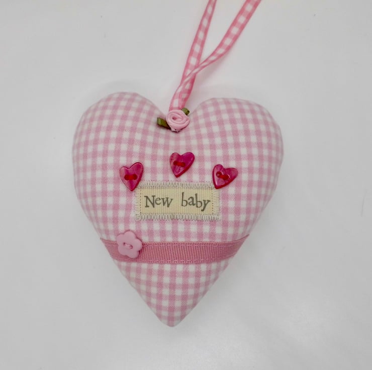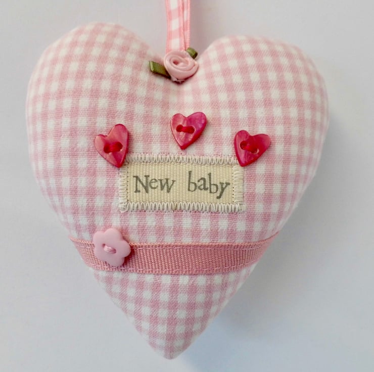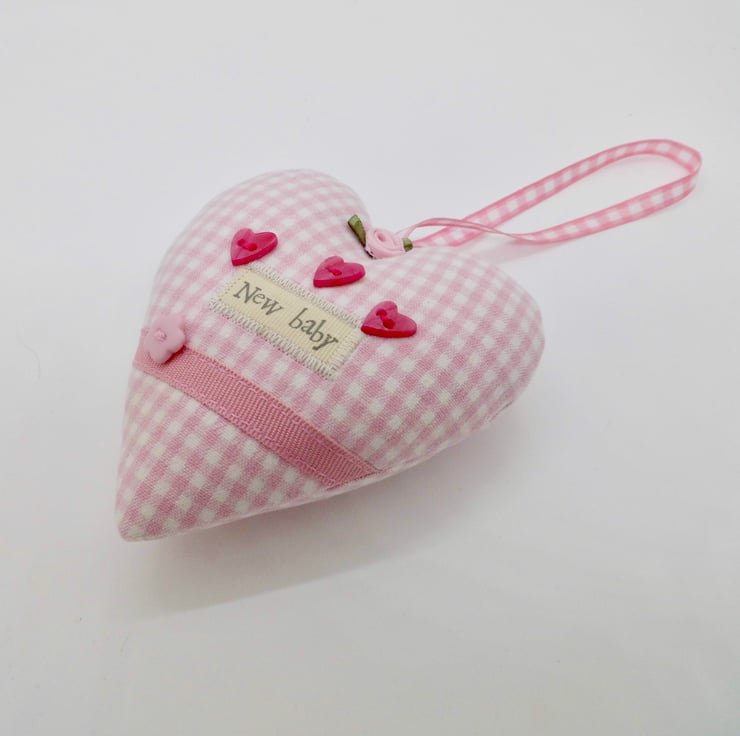 A padded heart-shaped decoration to celebrate the birth of a new baby girl. Made with tiny check fabric in pink and white with ribbon appliqué, decorative buttons and a pink ribbon rose.