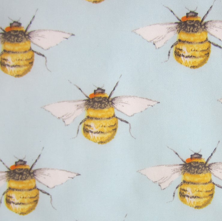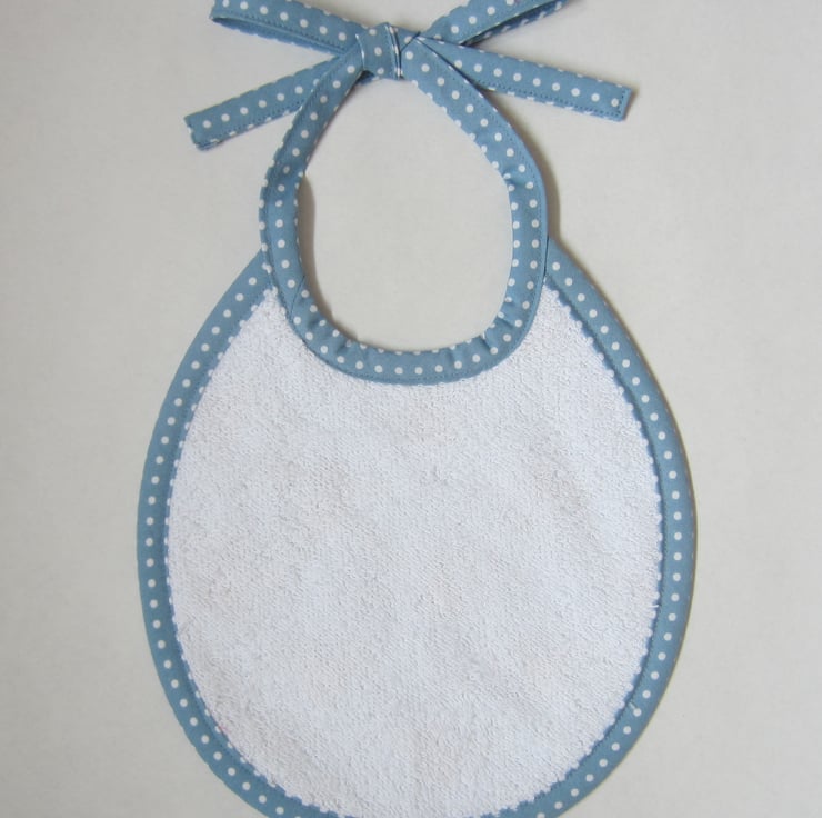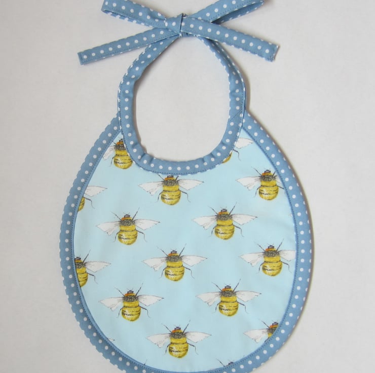 First size baby bib in a bees on light blue background fabric. It is edged in a soft feel spotty blue and white bias binding and backed with white towelling for extra protection.