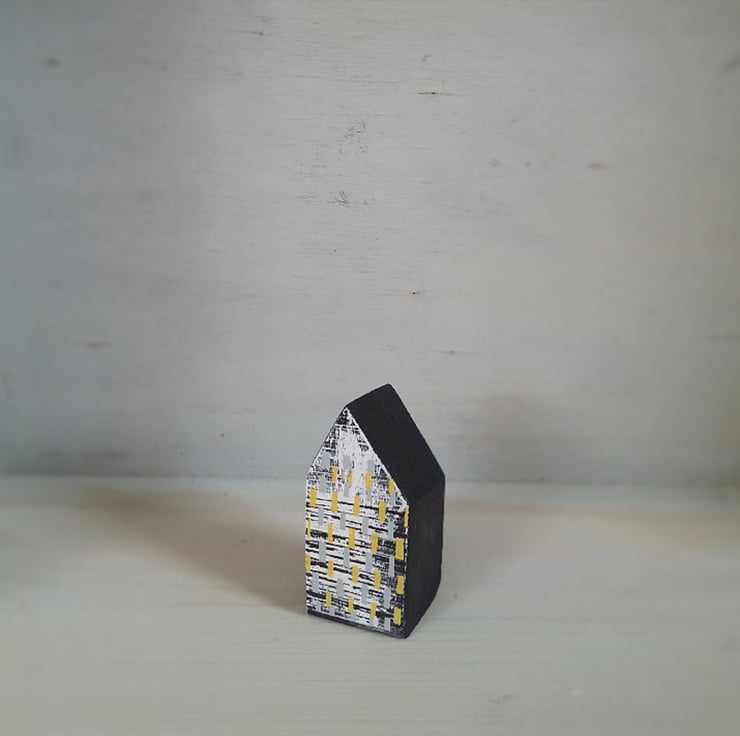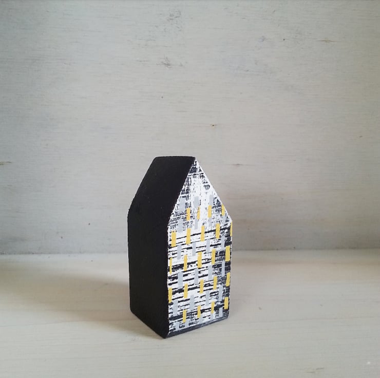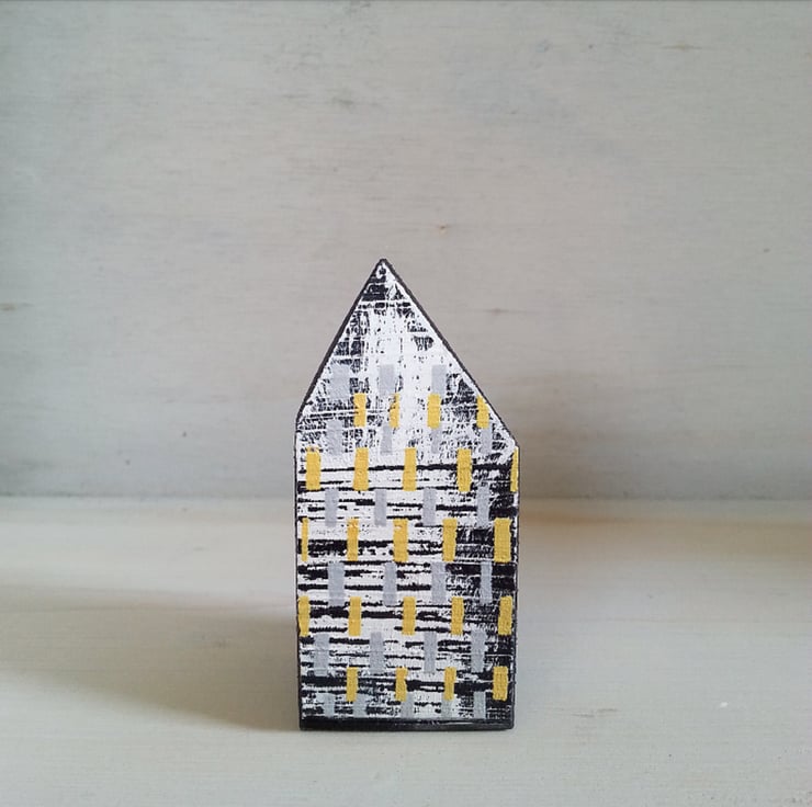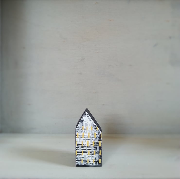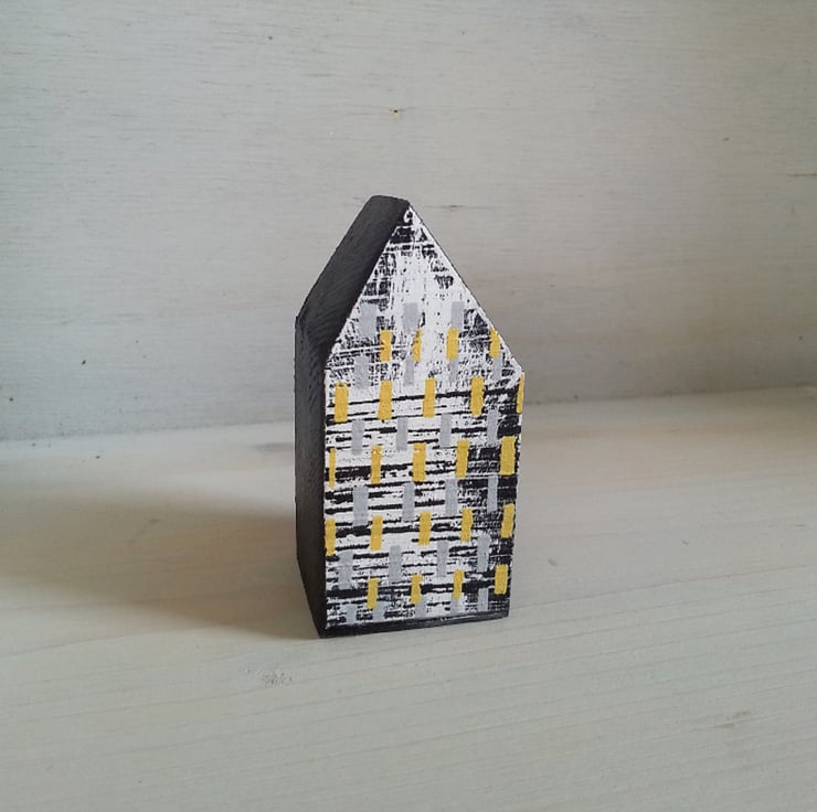 This one of a kind little wooden house is made from reclaimed wood and is painted and screen-printed in black and white with yellow and grey lines and dashes. The back of the house is blank.