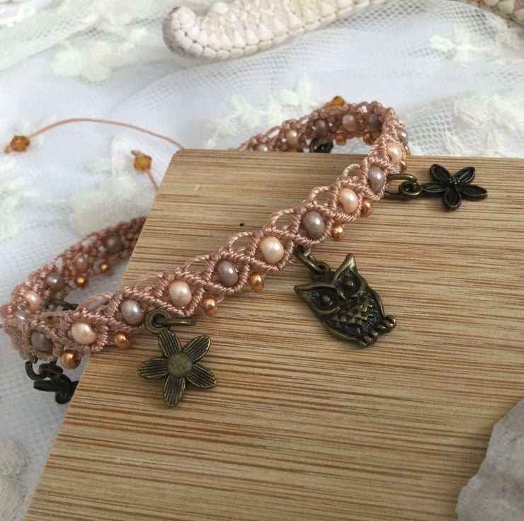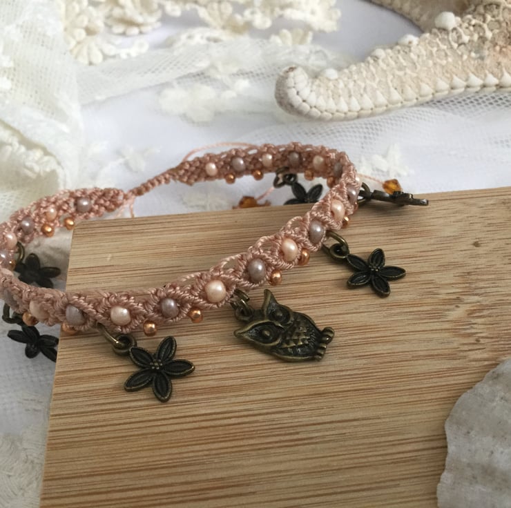 I have threaded coffee and Peach coloured glass seed beads into the design and along the lower edge I have attached antique gold coloured flower charms with a central owl charm together with tiny glass seed beads in gold.