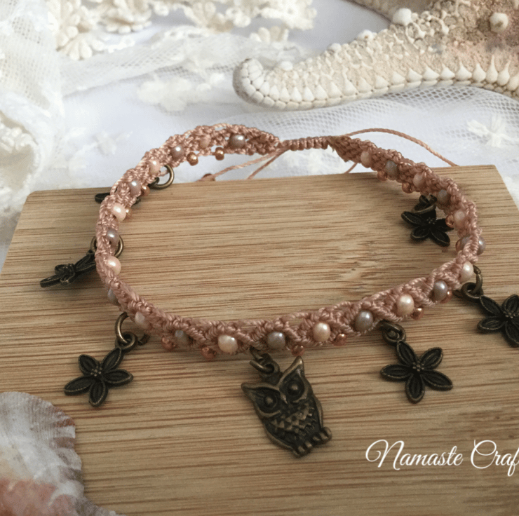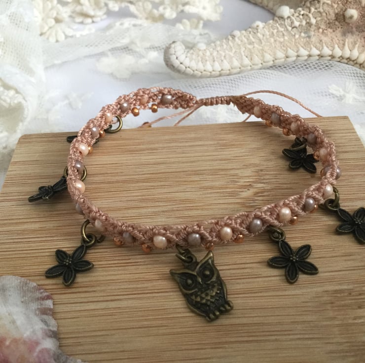 This adorable pretty anklet is handmade using the delicate technique of micro macrame in shades of peach and antique gold using high quality strong C Lon macrame thread.