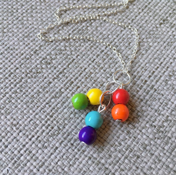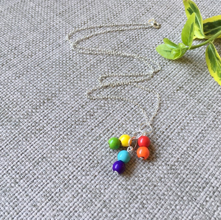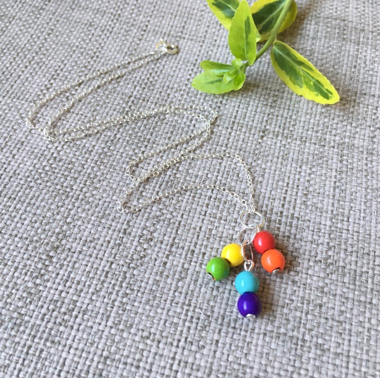 A simple and pretty pendant necklace made with 6mm round rainbow-coloured howlite beads, on a sterling silver chain. The pendant is approximately 3.5cm in length, and the chain is available in a choice of 16 or 18 inch length. Coordinating earrings and bracelet are also available.