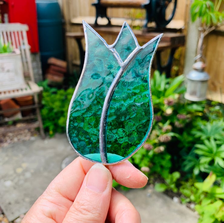 Each piece of glass has been hand cut, ground, foiled and soldered together, a copper coloured rod has been attached which measures approx 30 cms, this can be cut if you would like it shorter.
