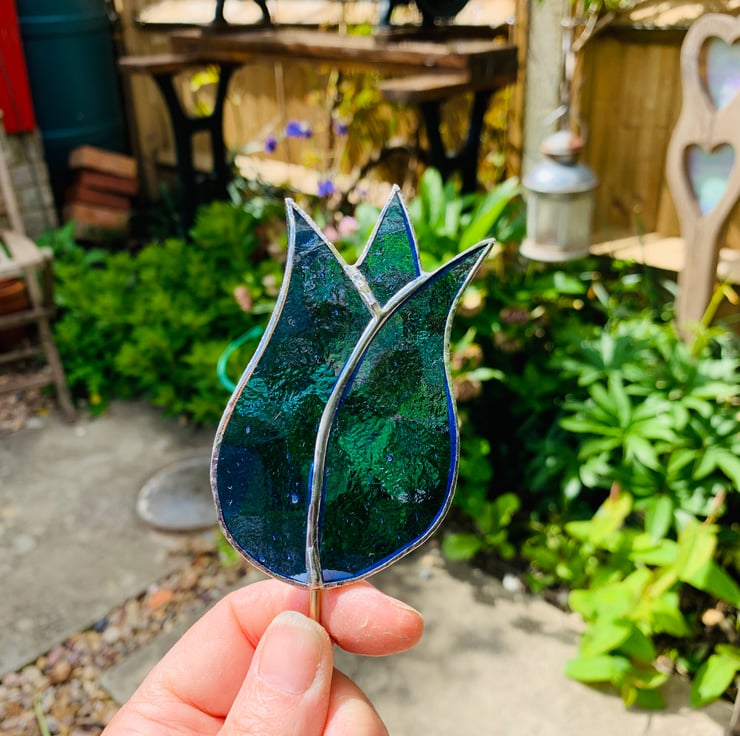 Each piece of glass has been hand cut, ground, foiled and soldered together, a copper coloured rod has been attached which measures approx 30 cms, this can be cut if you would like it shorter.
