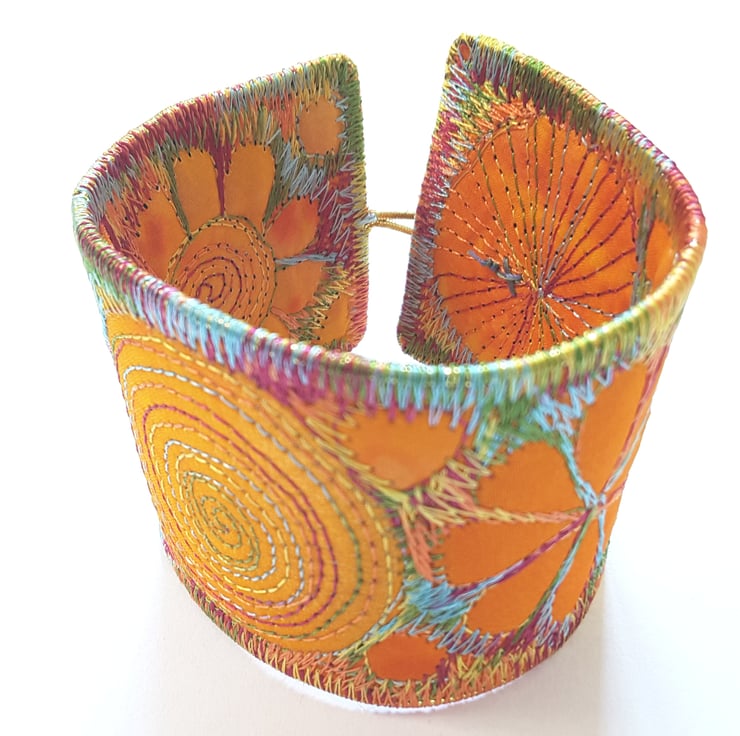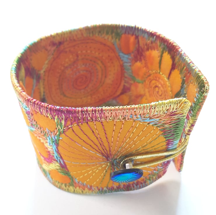 Made from layers of fabric including hand dyed Egyptian cotton and silk fabrics using the free machine embroidery style of sewing