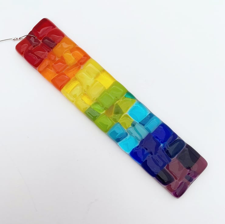 To make this, I have hand cut and shaped a rectangle of specialist transparent art glass. I then cut and shape each tiny piece of specialist art glass and arrange into the rainbow pattern. I then fused the whole thing overnight in my kiln. Multicoloured glass in a mosaic design.