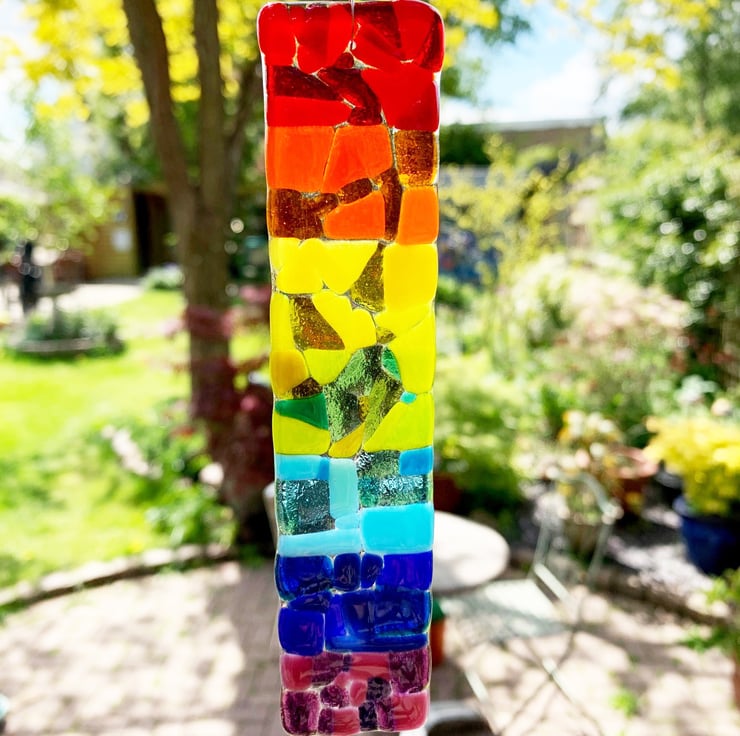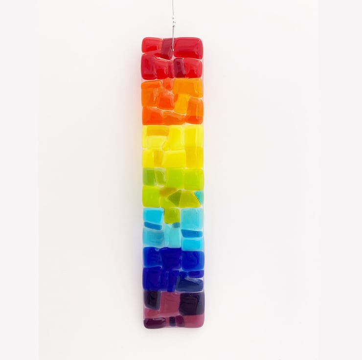 Fused glass hanging rainbow stick. These long rainbows suncatchers are a mixture of transparent and opaque glass in all the colours of the rainbow. These look stunning when hung in a window allowing the light to filter in through the different coloured glass. It would make a lovely gift for a friend or relative, adding a splash of bright colour to their day.