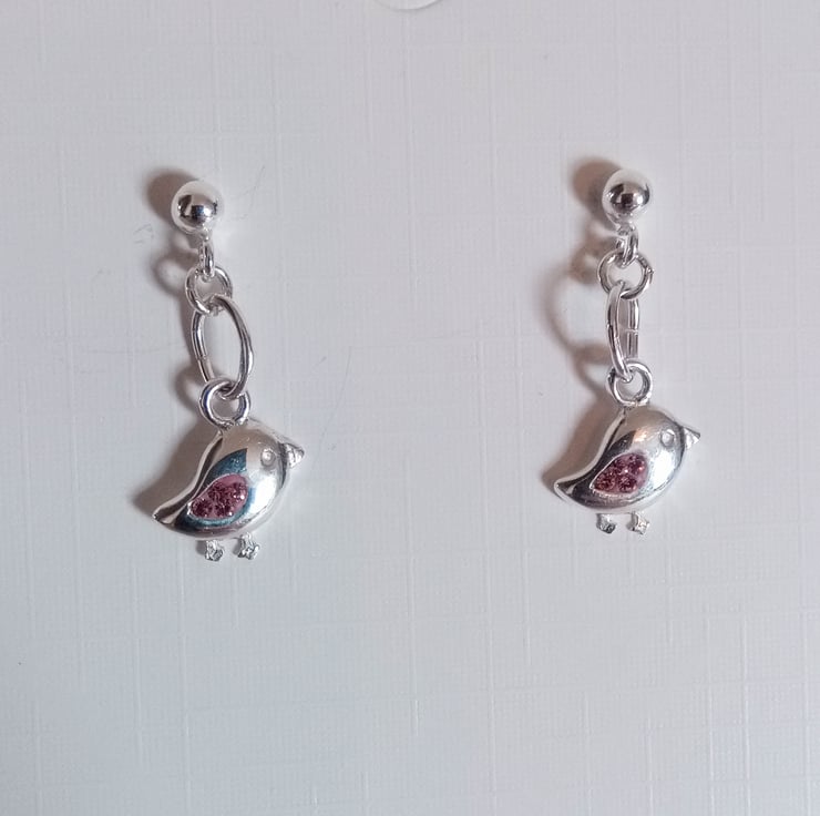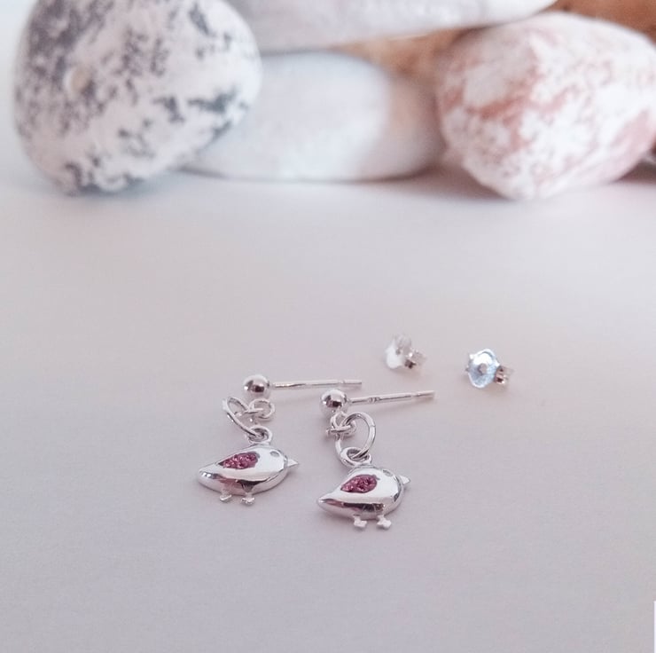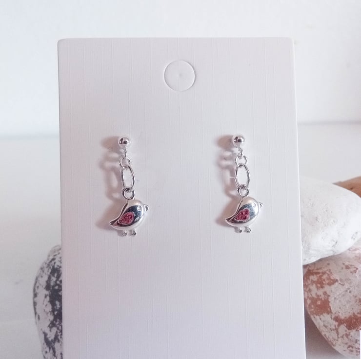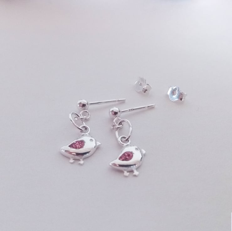 Be the envy of your friends wearing these bird earrings. The bird charms are 9mm and are sterling silver with a pink zirconia crystal wing.
