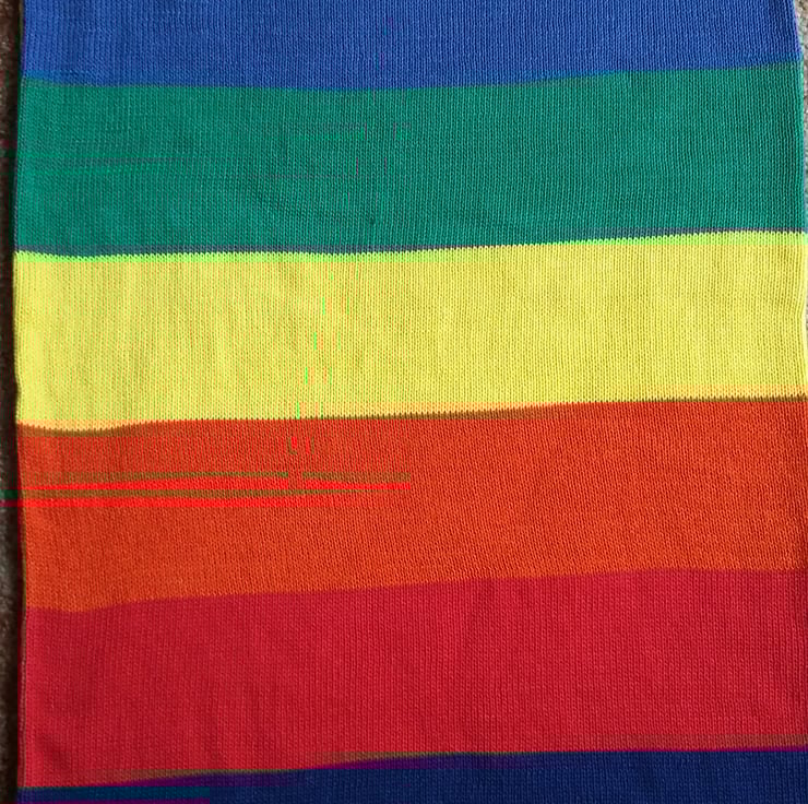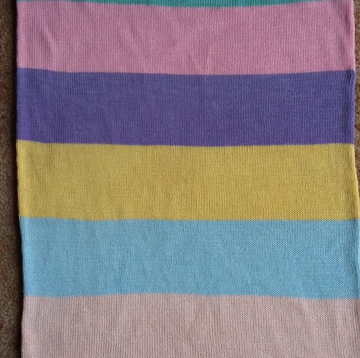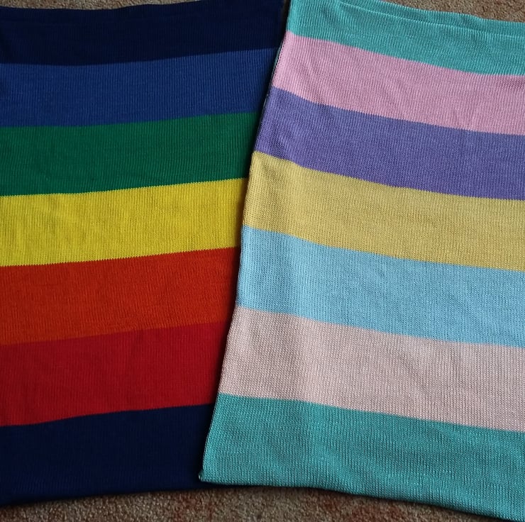 Baby Blankets with wide stripes made in machine washable cotton. These are rainbow colours or pastel colours but they can be made to order in any colour combination. They are striped on one side and plain on the other. Those made to order will need to be full price. These blankets are samples so just surplus stock.