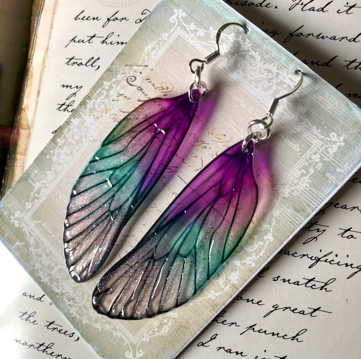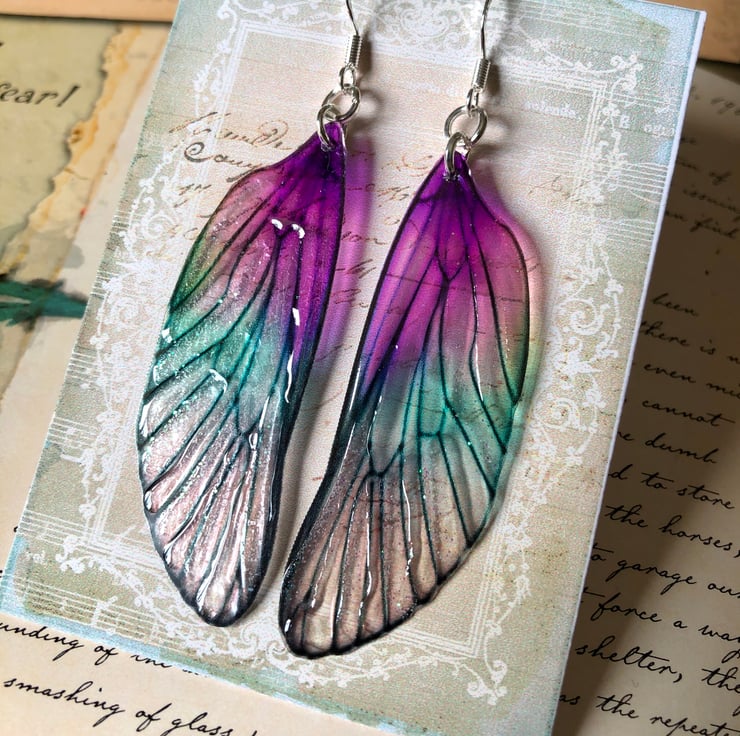 Purple translucent fairy wing earrings.