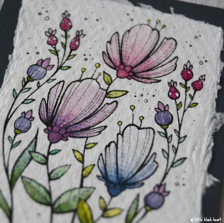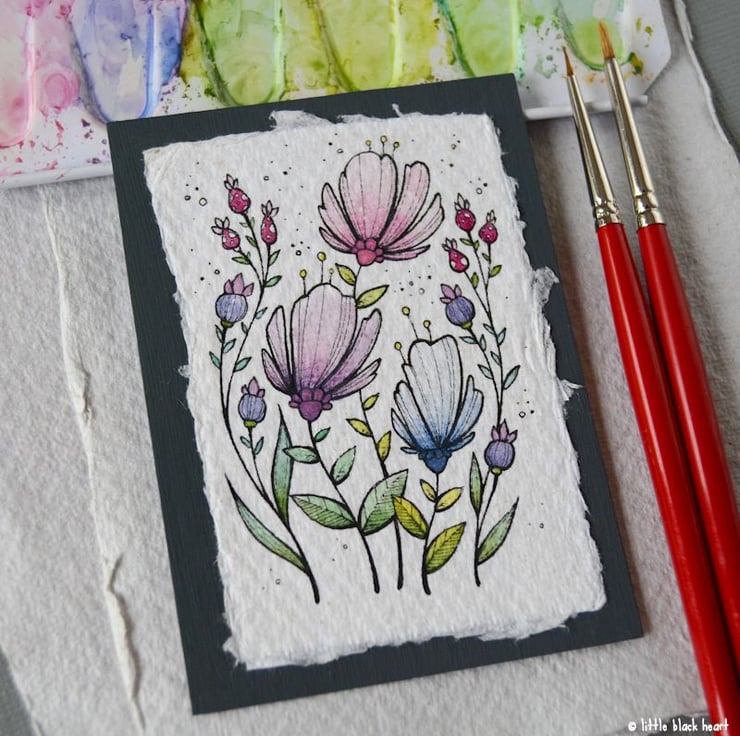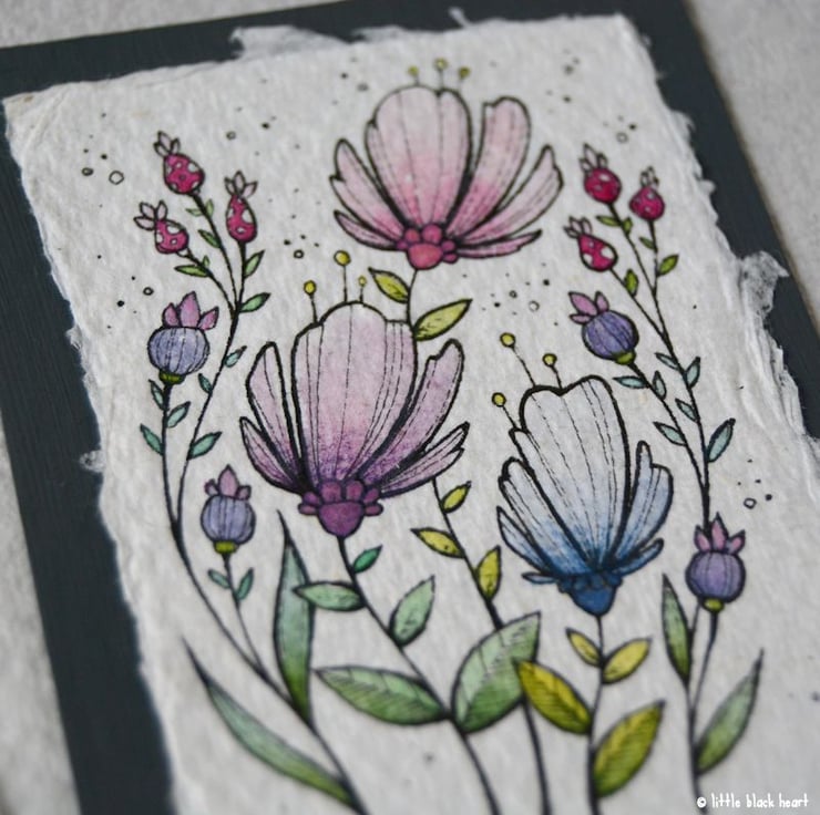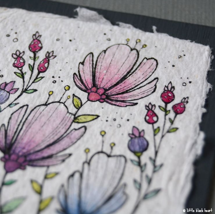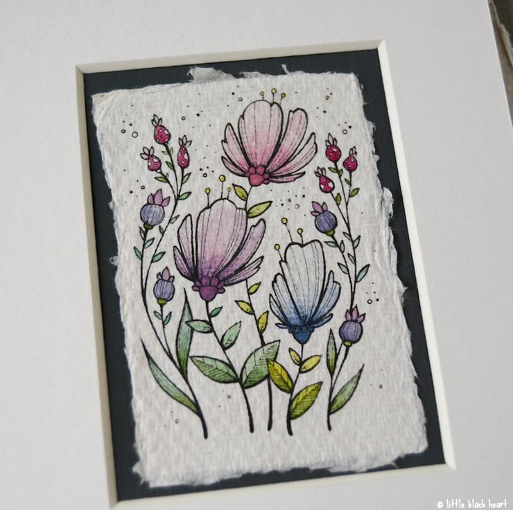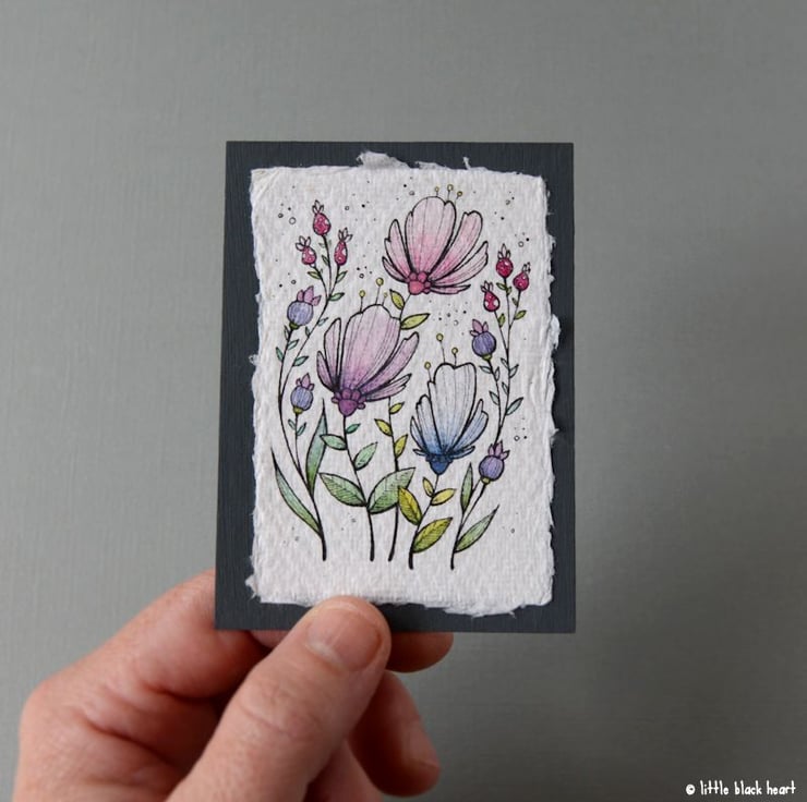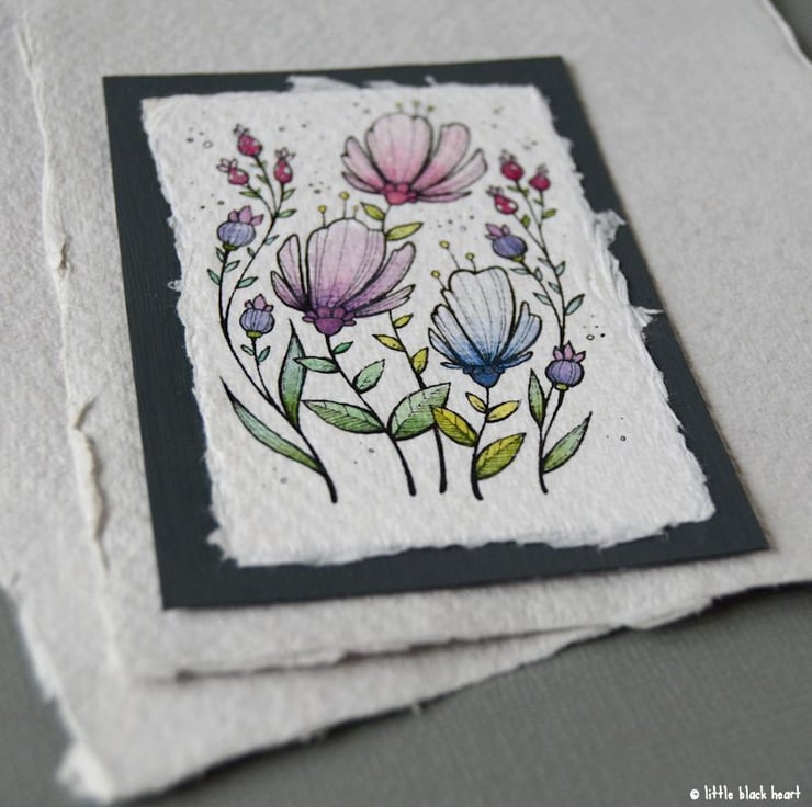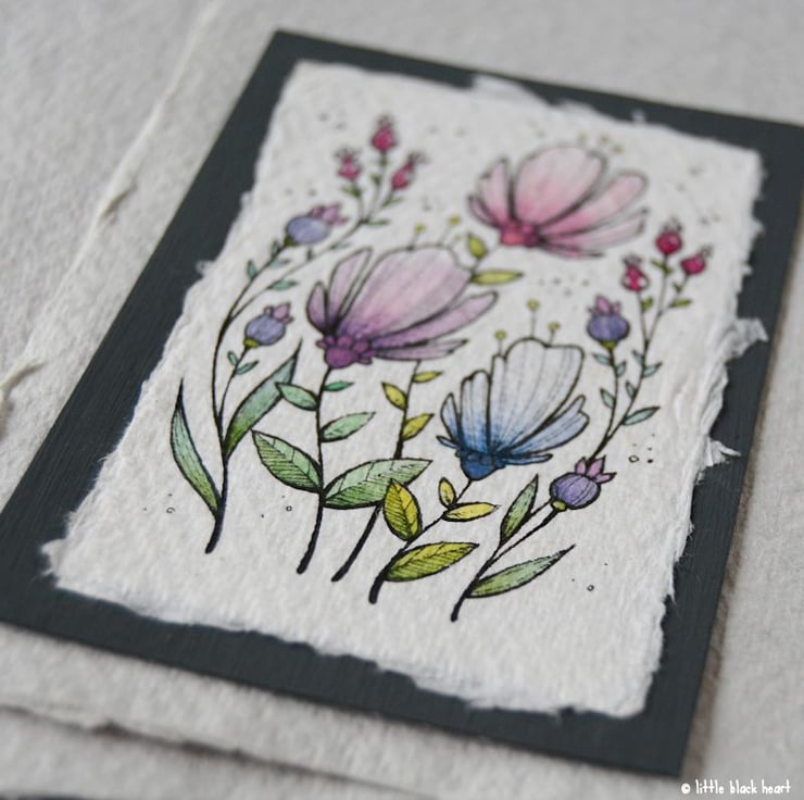 khadi paper is handmade in india from recycled cotton rag, it has a lovely textured surface and deckled edges. I have then mounted the illustration onto a hand painted aceo.