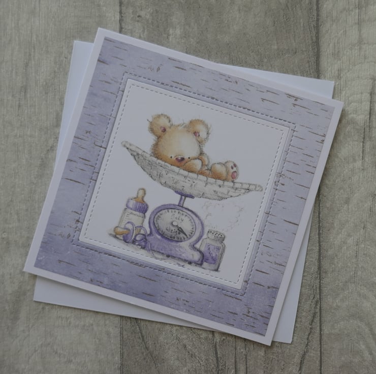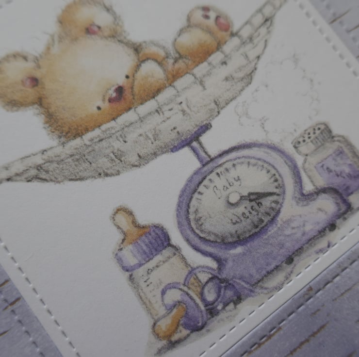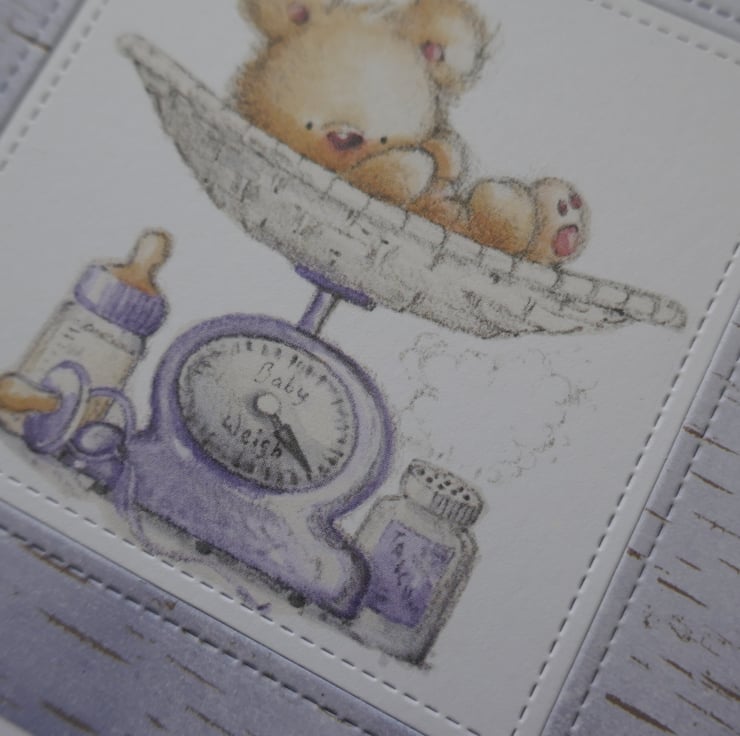 A piece of lilac patterned paper has been attached to the front of the card leaving a white border around the edge. A stitched aperture has been die cut in the centre with the cute Lili of the Valley precoloured image inlaid into the frame.