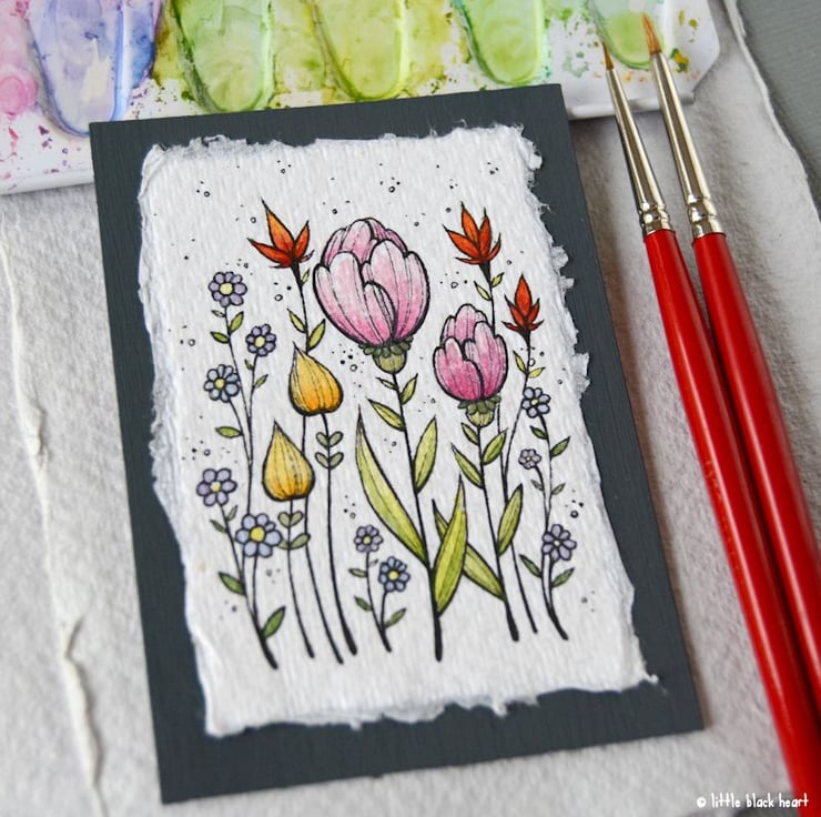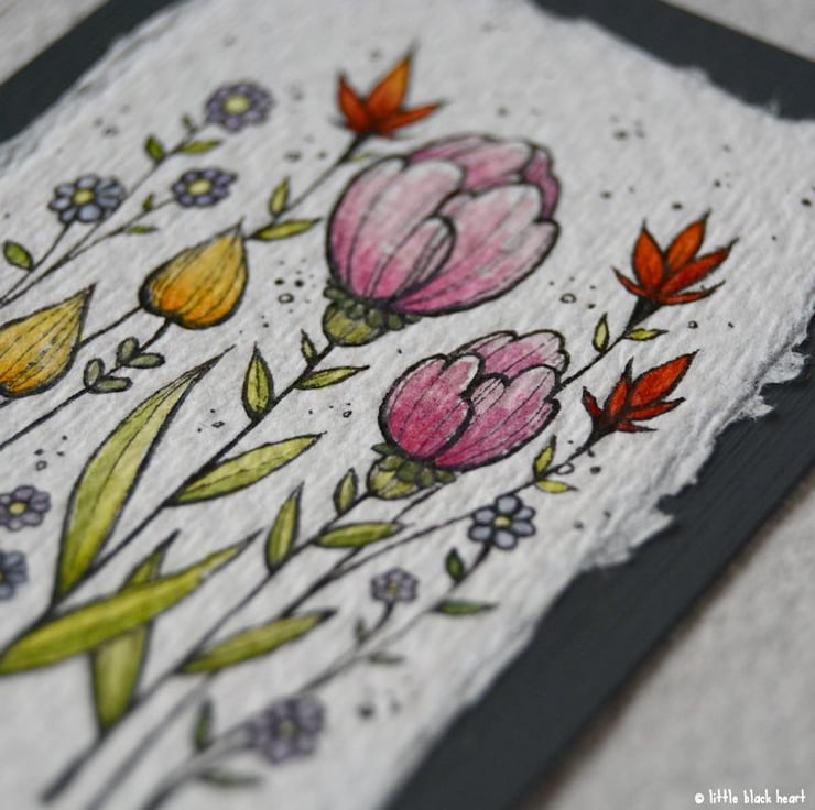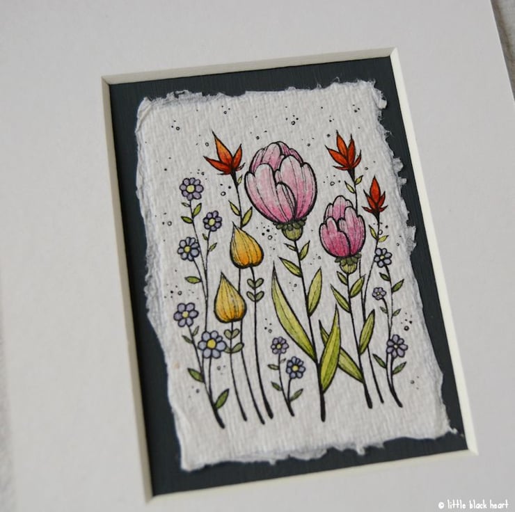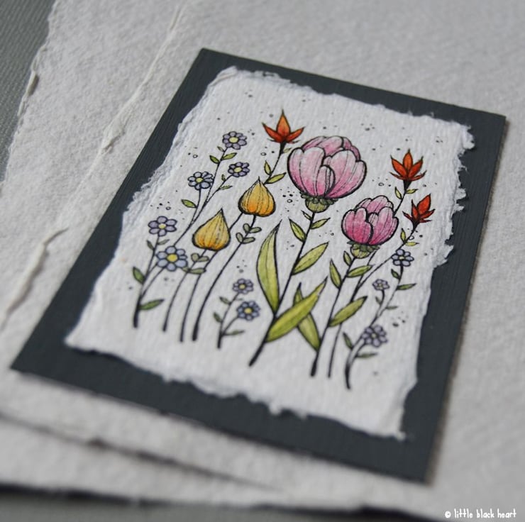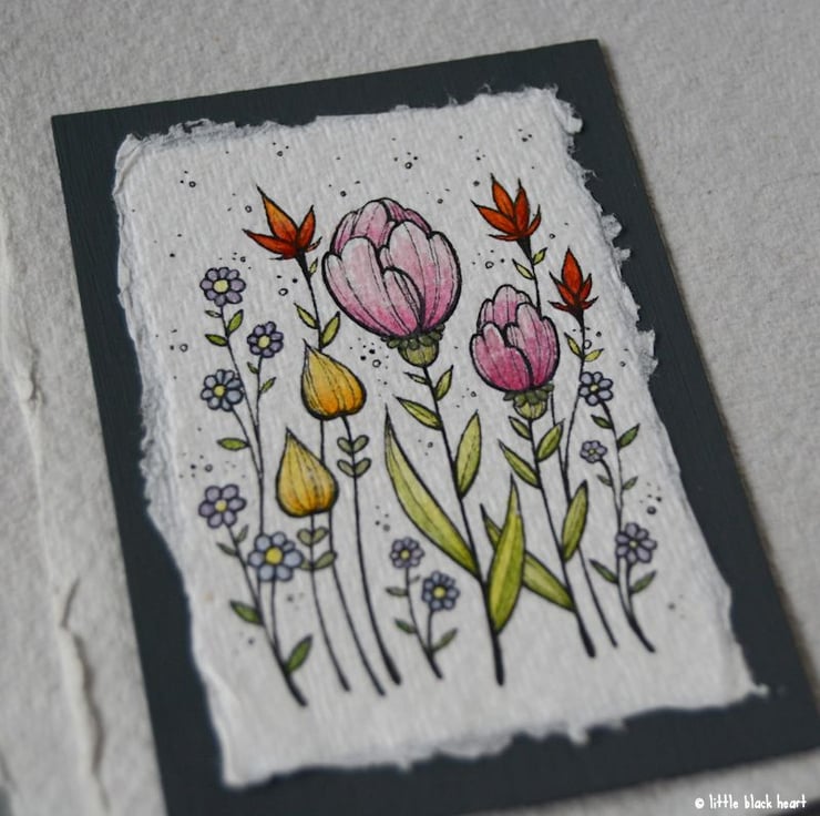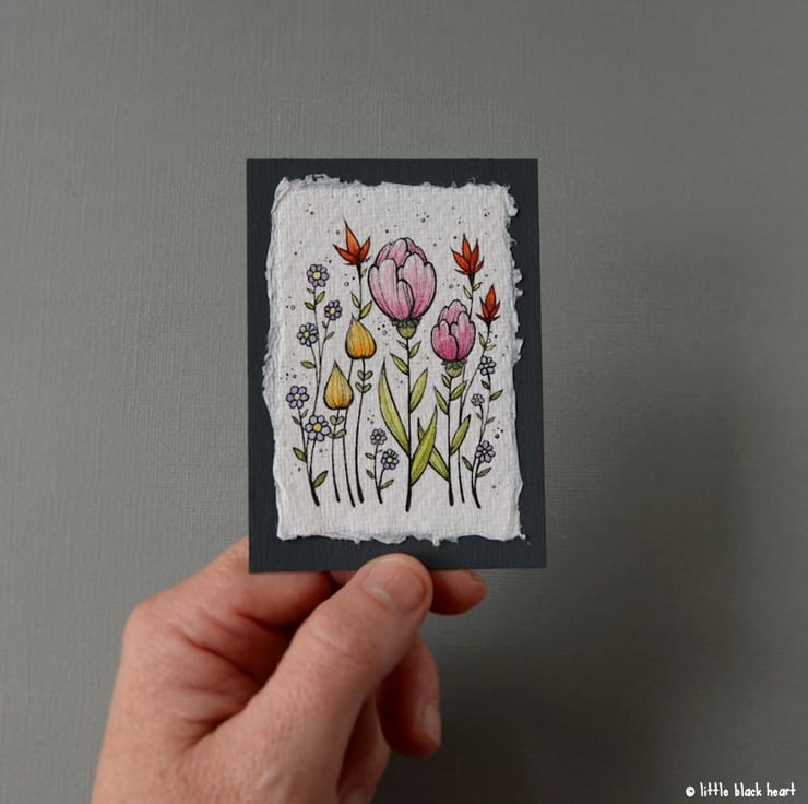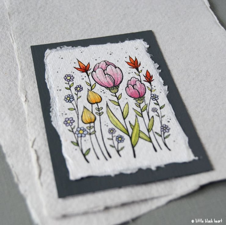 khadi paper is handmade in india from recycled cotton rag, it has a lovely textured surface and deckled edges. I have then mounted the illustration onto a hand painted aceo.