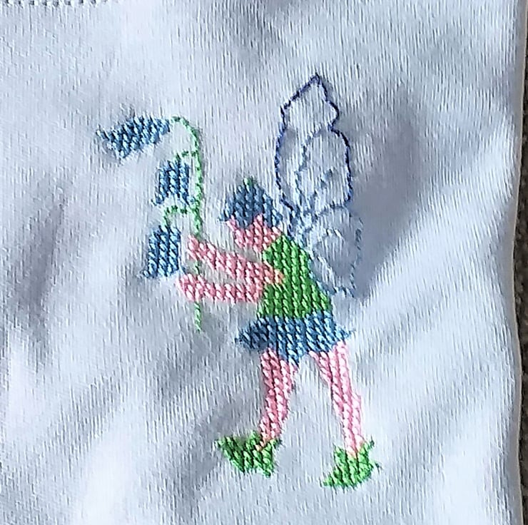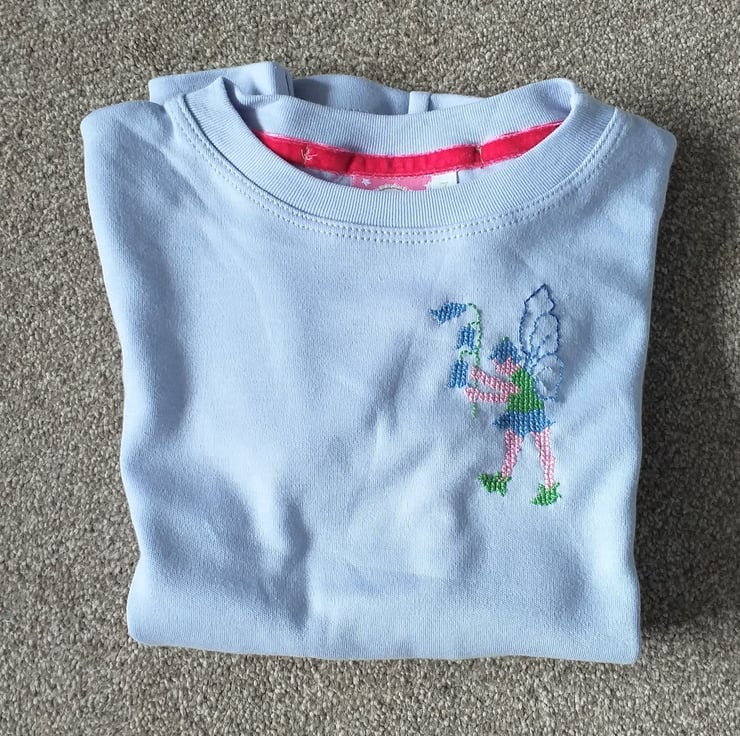 I thought I'd try a new venture, and embroider T-shirts with long sleeves. Our garden is currently full of wild bluebells (well, we've never planted any, and we've been here 50 years!) This little fairy just came in and picked some!