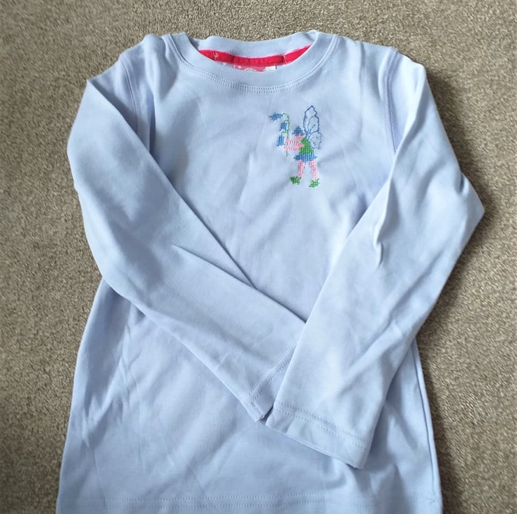 This is such a pretty pale lilac, long sleeved T-shirt for a seven-year-old. I have hand embroidered a fairy of my own design on the left side. He is dressed in bluebell colours, has delicate blue wings and is holding a sprig of bluebells in his hands. The shirt has a band of pink velvet at the back of the neck. It is 100% cotton and machine washable.
