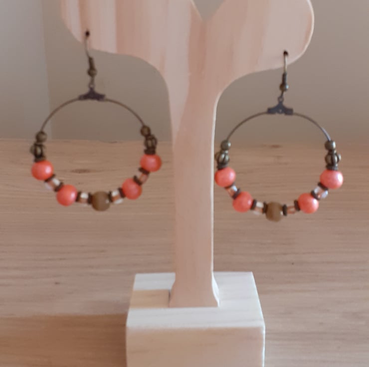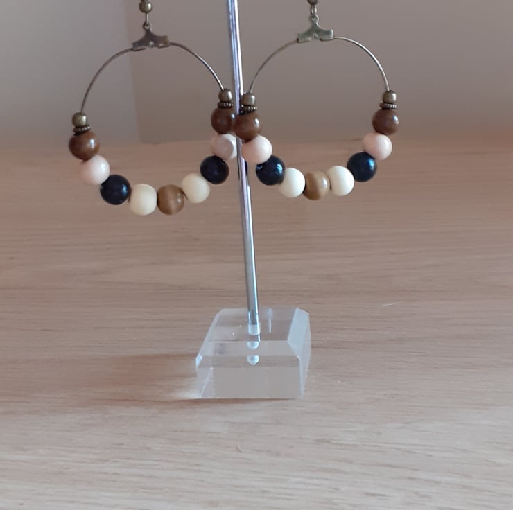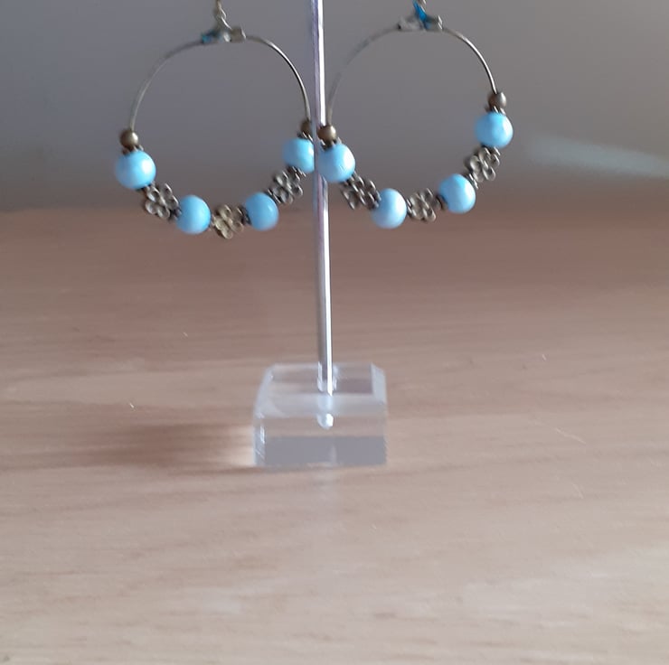 BOOHOO STYLE HOOP EARRINGS - ANTIQUE BRONZE AND PALE BLUE WOODEN BEAD EARRINGS.