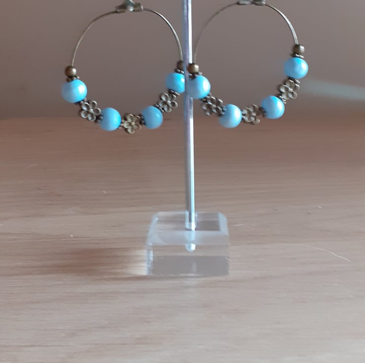 THESE ATTRACTIVE BOOHOO STYLE DANGLE HOOP EARRINGS HAVE BEEN MADE USING ANTIQUE BRONZE HOOPS ALONG WITH ANTIQUE BRONZE FLOWER SHAPED SPACER BEADS, PALE BLUE SMALL ROUND WOODEN BEADS, AND FINISHED WITH ANTIQUE BRONZE FISH HOOK EAR WIRES.