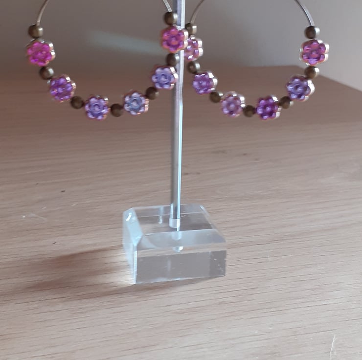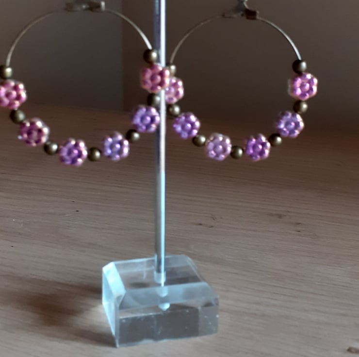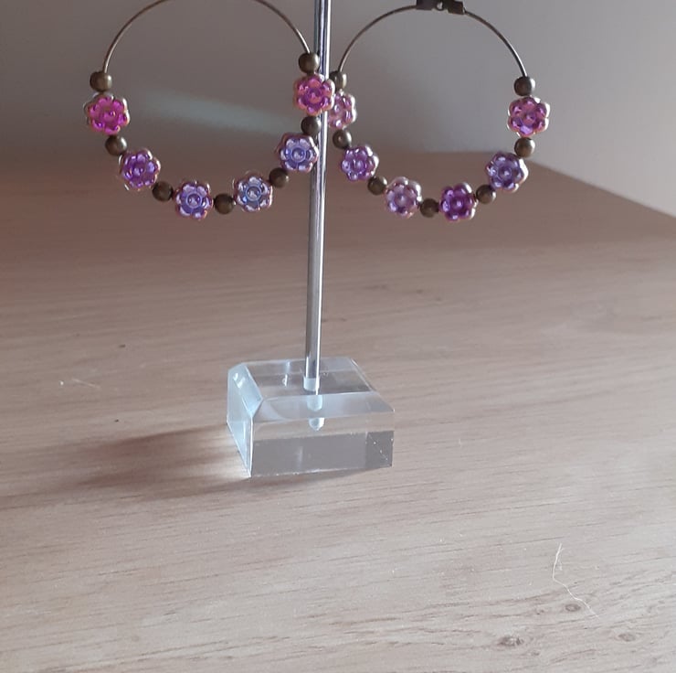 THESE ATTRACTIVE BOOHOO STYLE DANGLE HOOP EARRINGS HAVE BEEN MADE USING ANTIQUE BRONZE HOOPS ALONG WITH ANTIQUE BRONZE SPACER BEADS AND GLASS FLOWER SHAPED MULTI PEARLISED COLOURED BEADS, AND FINISHED WITH ANTIQUE BRONZE FISH HOOK EAR WIRES.