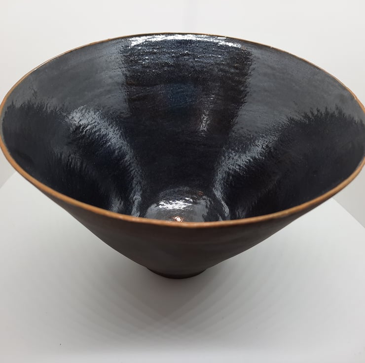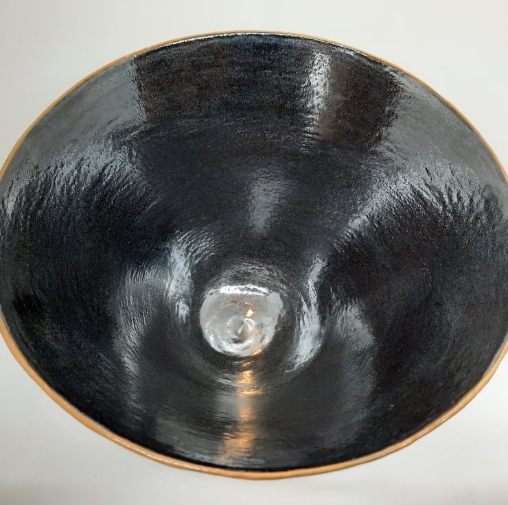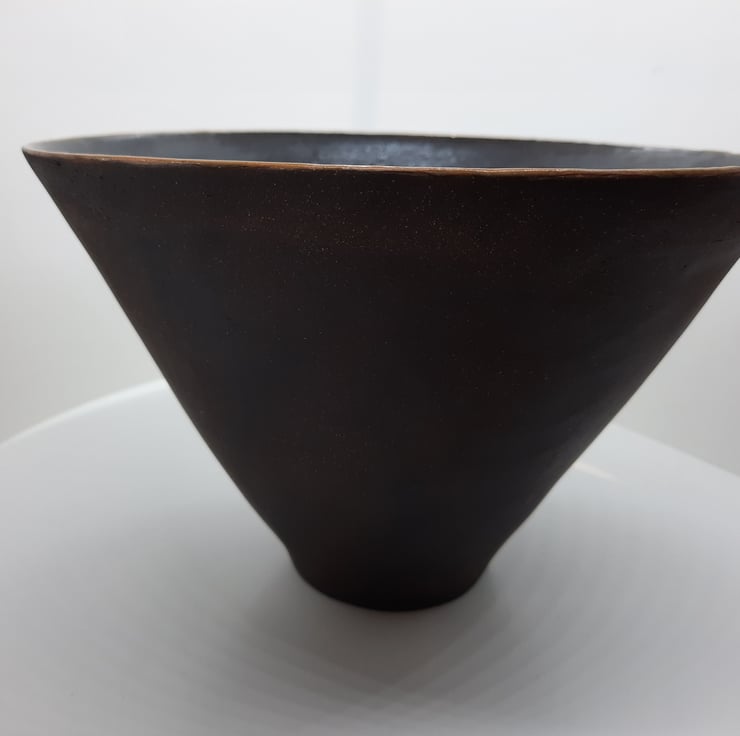 A tall small based ceramic bowl using black clay which has a wonderful natural dark grey brown colour when fired to a high temperature. The bowl is not glazed on the outside to show this, making it tactile.