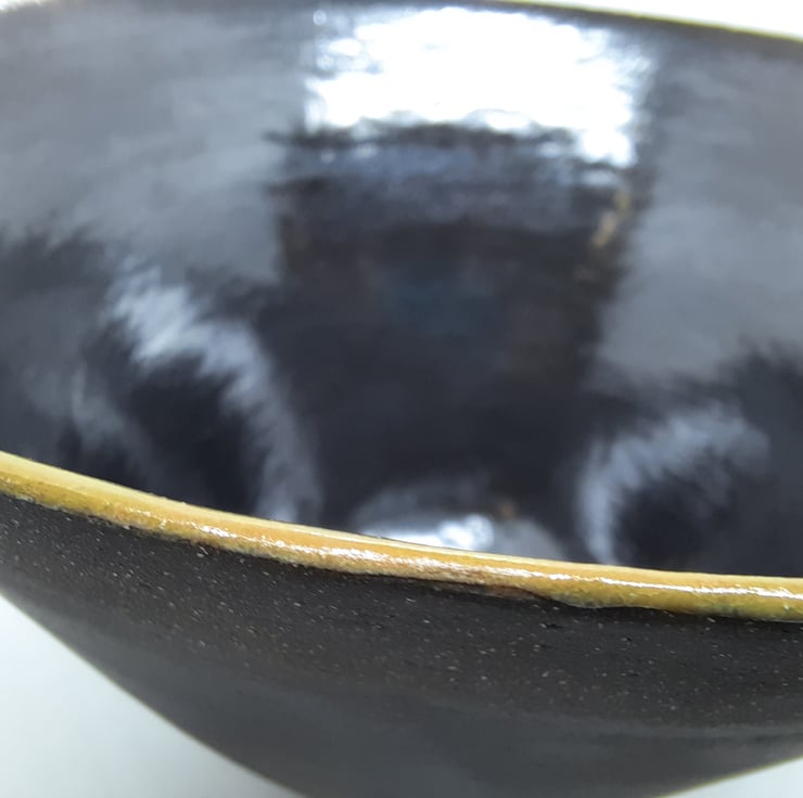 The inside has a dark glossy glaze allowing it to be used for food. There is an orange brown around the rim to finish it off.