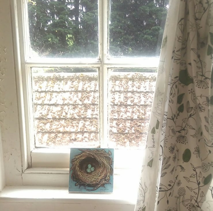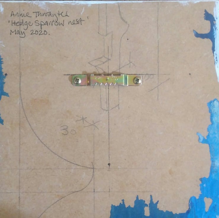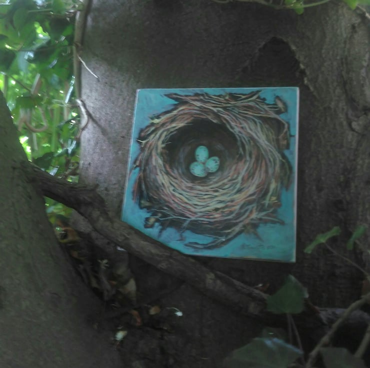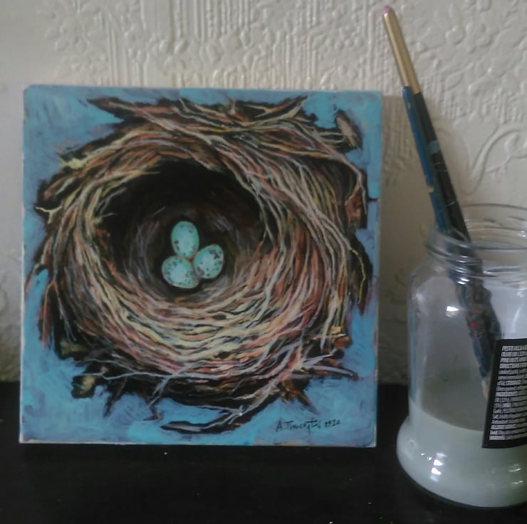 An original painting of a hedge sparrow nest and eggs. It is painted in acrylic inks onto a piece of MDF which is an offcut from a carpentry workshop, and would otherwise have gone to landfill.