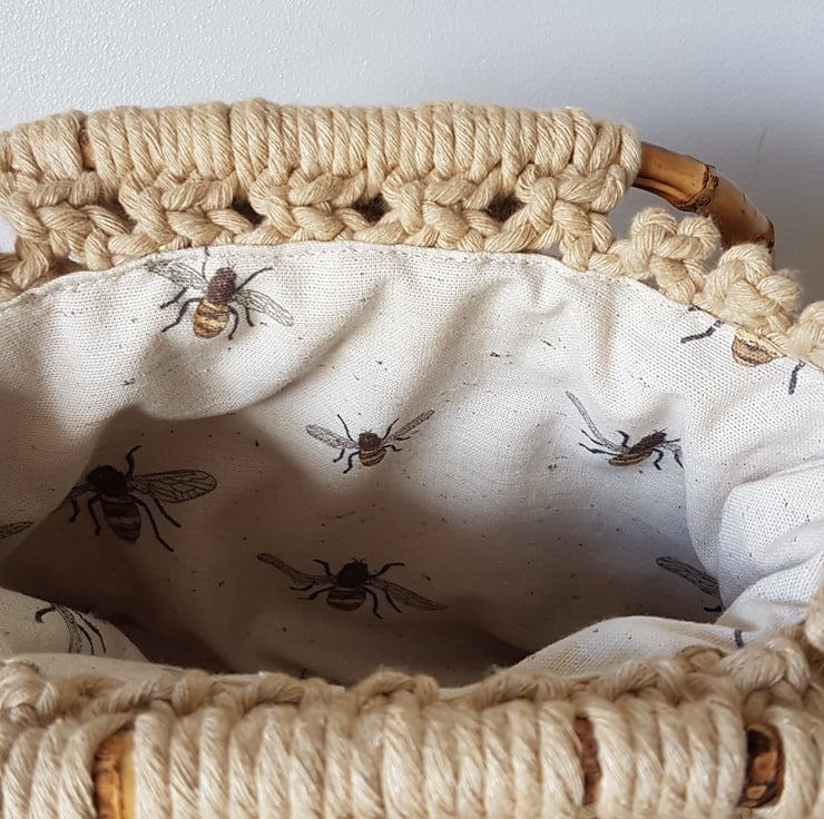 This bag is part of a collection of Bee themed handbags. It has a double lining with the inner one being the characteristic bee cloth from Quarry Bank National Trust. The outer lining is beige and can be glimpsed through the design of the bag.