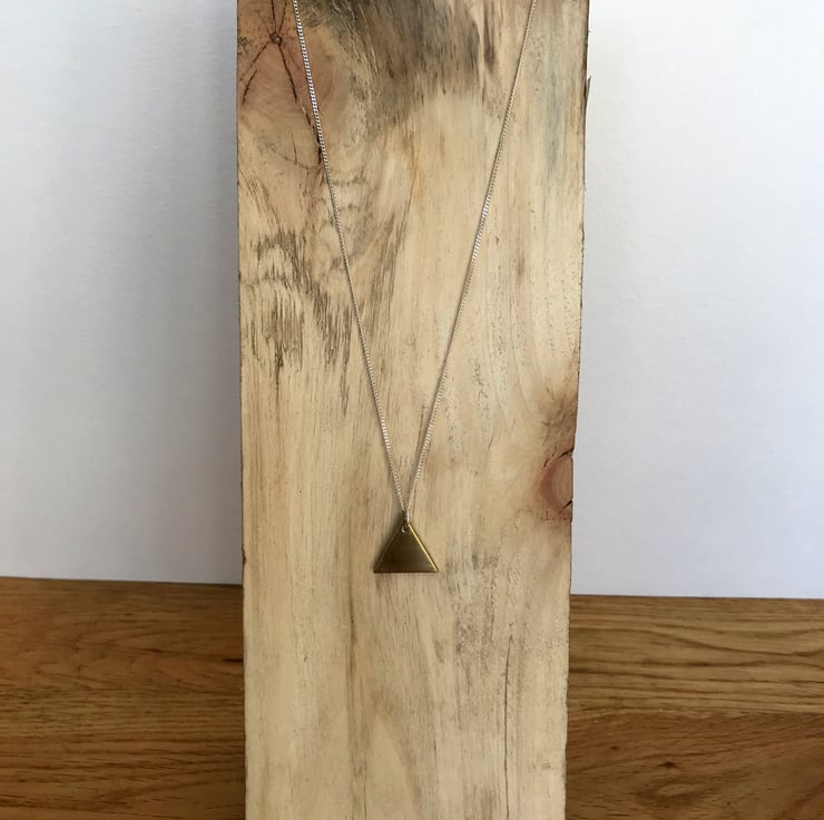 Metal triangle necklace cut from an old-style pound coin on a 925 stamped sterling silver chain.
