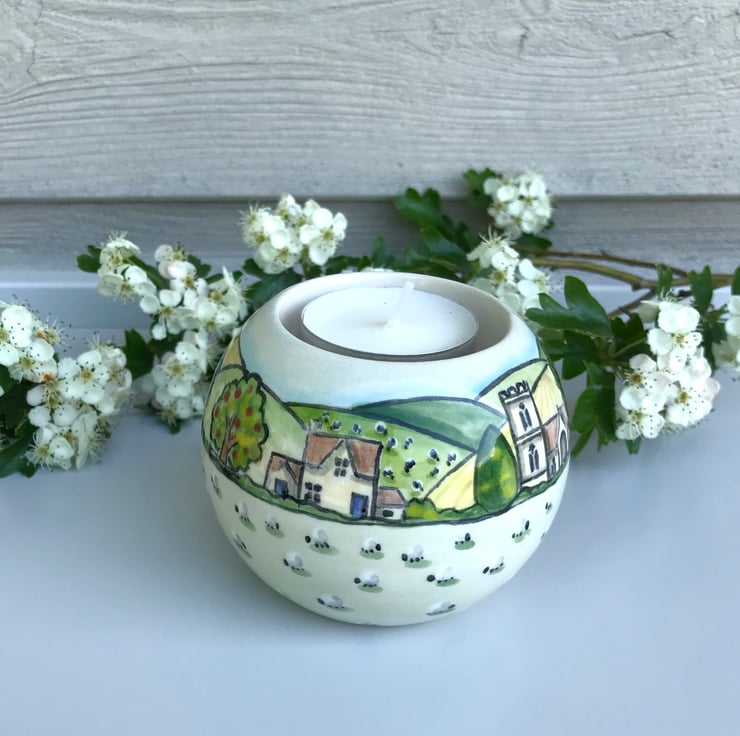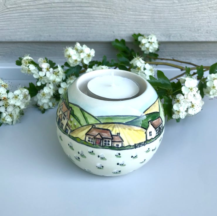 This ceramic T light holder is individually hand painted in bright glazes by myself and so will be unique. A scene of little houses, rolling countryside and of course fields full of cows and sheep are painted around the holder before it is dipped in clear glaze and kiln fired.