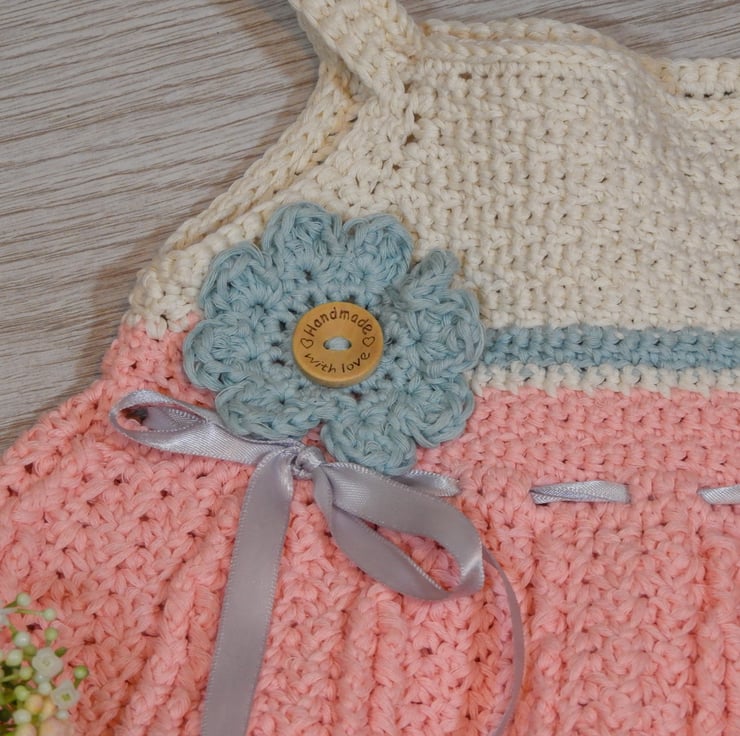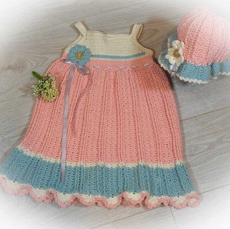 This beautiful sundress is ideal for summer weather but versatile enough to be worn over a T-shirt when the weather is a little cooler. Made from 100% cotton the dress and hat are both finished with a flower applique and trimmed with satin ribbon for the perfect summer look.