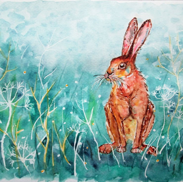 A cute hare sitting amongst plants and weeds. Painted with detail and in a turquoise background.