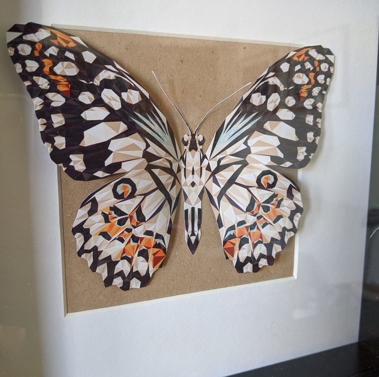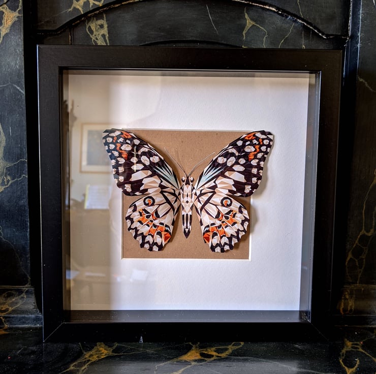 This one of a kind butterfly box contains a paper Madagascan Emperor Swallowtail butterfly. Made from hundreds of tiny triangles, this design gives the butterfly a three-dimensional effect that makes people want to look closer!
