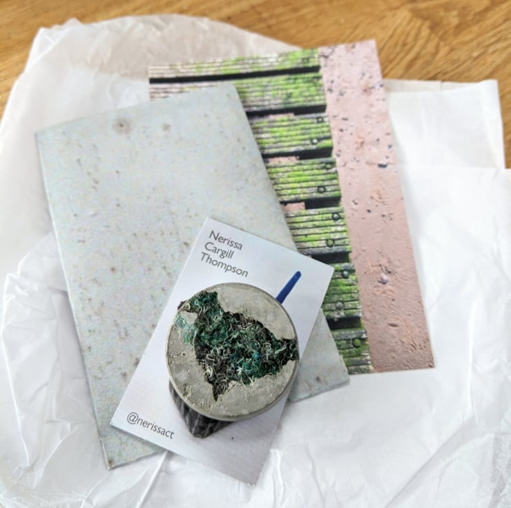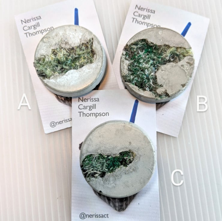 To limit my waste, I turn my colourful textile offcuts into jewellery. I combine the embellished textiles with cement in plastic food packaging giving the resulting brooches a bold contrast of textures. These brooches are 50mm across and taper slightly to the front. Each unique brooch has a standard safety clasp back attached using epoxy resin.