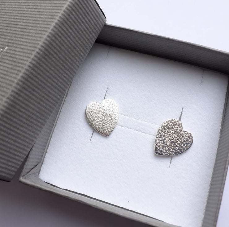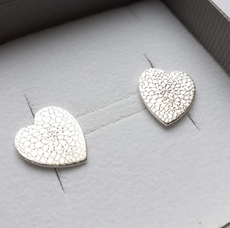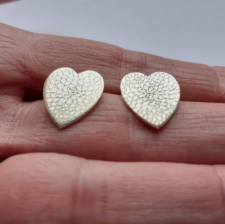 Recycled sterling silver heart studs freehand engraved with our signature chrysanthemum flower design.