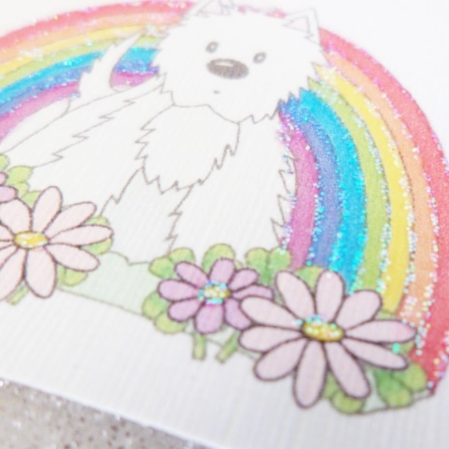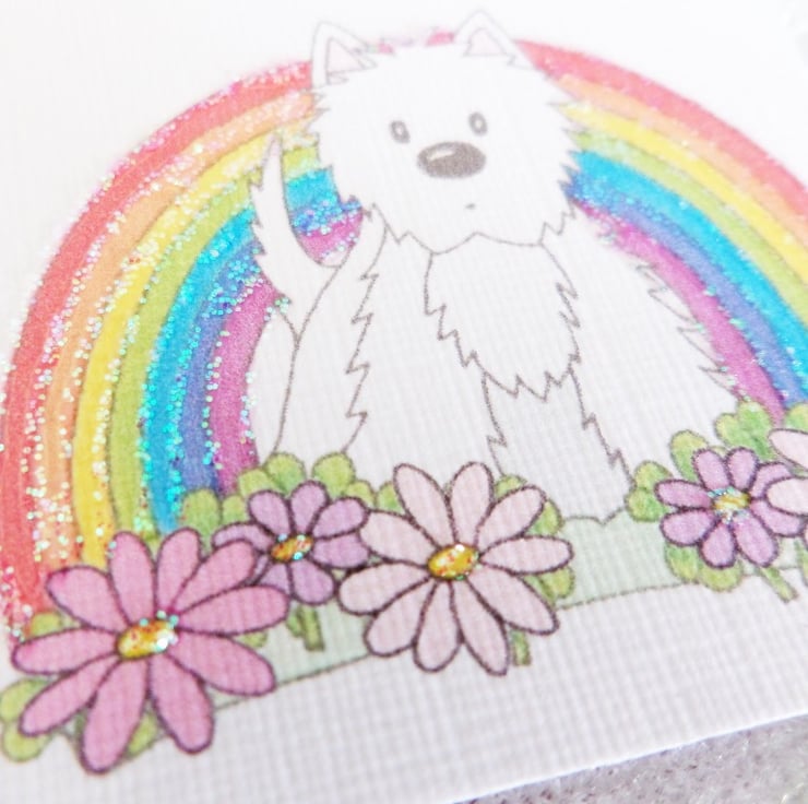 These cute 'Rainbow Flower Westie’ gift tags have been designed using my own original watercolour illustration. I have designed them to match and compliment my handmade cards in the same design.