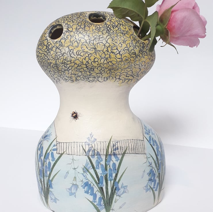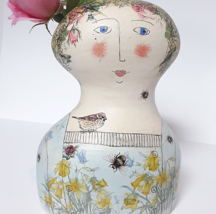 Hand built figurative vase measures approximately 25cms in height. Decorated with coloured slips and glazed in a transparent glaze.Ceramic decals of birds, bugs and flowers are fired on to add detail. An opening at the back of her head allow for dried flowers or grasses. Will be carefully packed and posted.