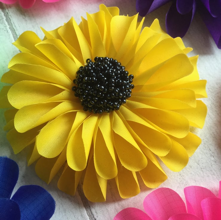 This bright and beautiful flower corsage is hand sewn from a yellow showerproof kite fabric. Each hand cut petal is folded and individually sewn onto a felt background to create the layers of petals. An upcycled earring front made from tiny black beads forms the centre of the flower. A metal brooch clip forms the closure and this would look great on a piece of clothing, hat or a black denim bag.