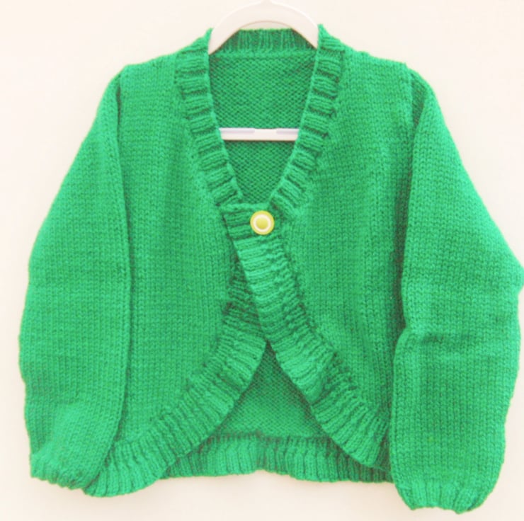 Beautiful curved front cardigan for a girl hand knitted in aran weight yarn. The cardigan has an attractive curved front border ending in a one button fastening. The cardigan is not currently in stock but it can be made for in a size and colour of your choice. Just let me know the colour you require when you order.