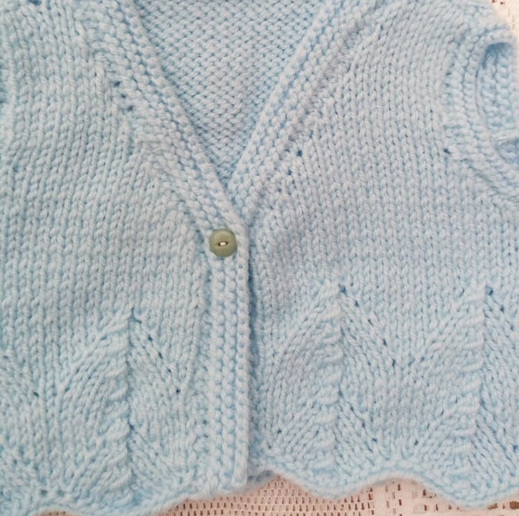 Beautiful waistcoat for a girl hand knitted in this pale blue aran weight yarn is in stock and is to fit a girl 2 - 3 years old with a 22 inch chest. It has a pretty open work pattern at the hem and is fastened by a single button.