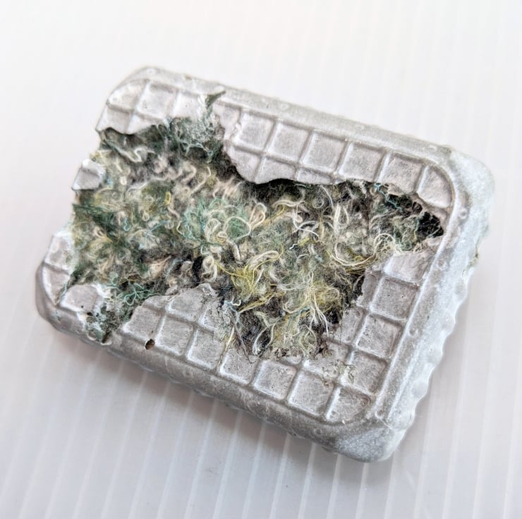 My work investigates change over time, not just eroding or decaying but new layers of growth, giving juxtapositions of structure and colour. Recent work highlights the issue of plastic pollution and the permanence of disposables through sculptures that combine embellished textiles and cement cast in plastic waste, inviting us to consider the packaging that we use and discard on a daily basis; objects that are so lightweight and seem so insignificant that we barely notice them. Naturally inspired textures emphasise the way our waste becomes subsumed into the natural world around us.