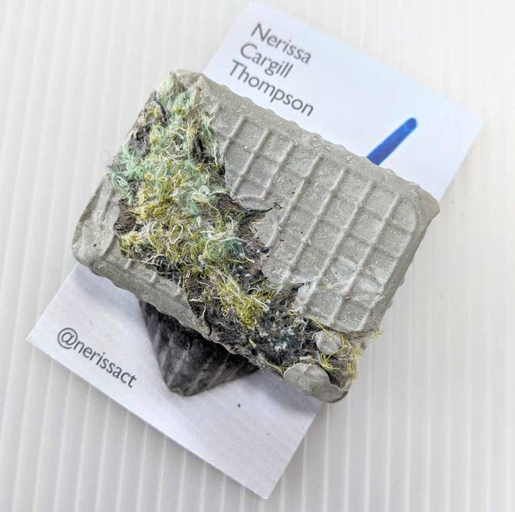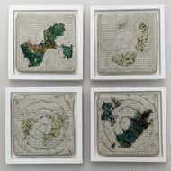 I create coastal inspired textures using a combination of embellishing and embroidery; blending a variety of recycled fabrics to create subtle variations in tone. These are stitched inside waste plastic to cast true to life pieces with cement giving a distinct contrast between the manmade structure of the packaging and the soft natural textures of the textiles.