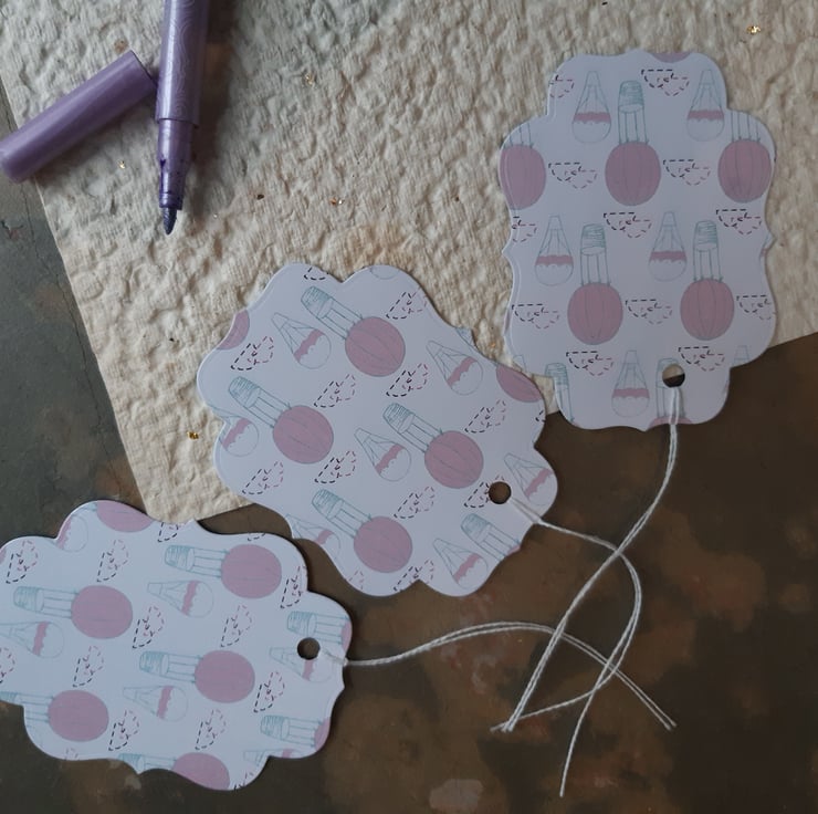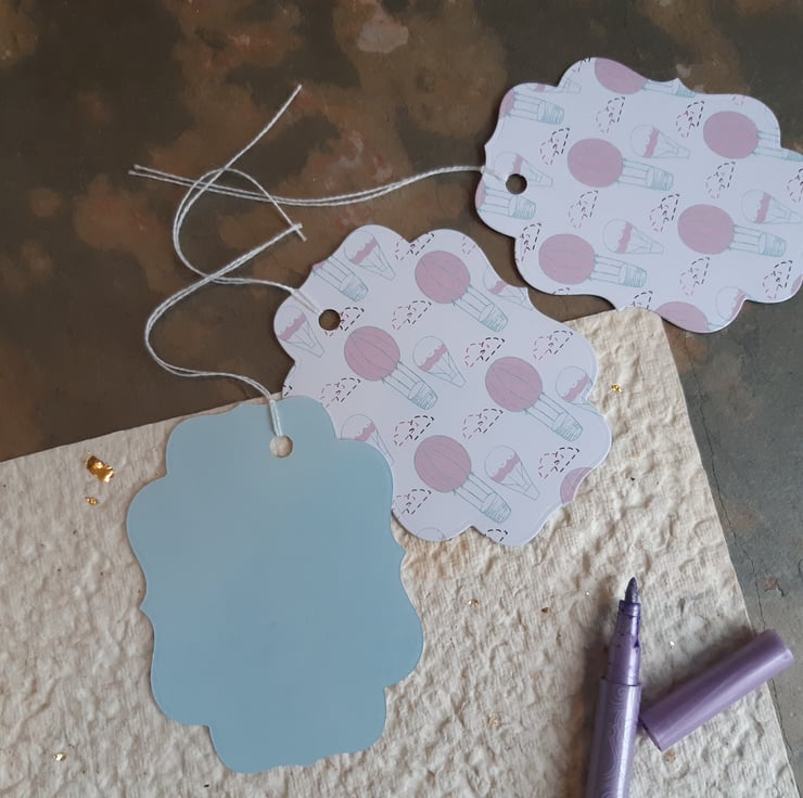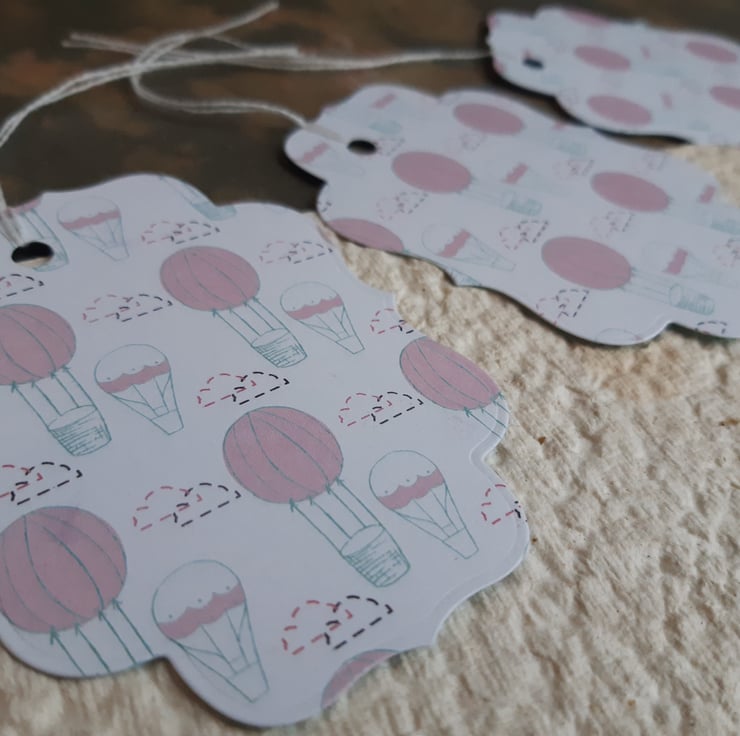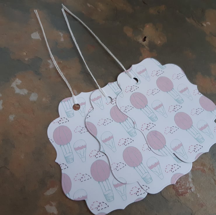 3 large (c. 8.5x6.3cm) die cut gift tags with a hot air balloon print in pink and white. Pale blue on reverse.