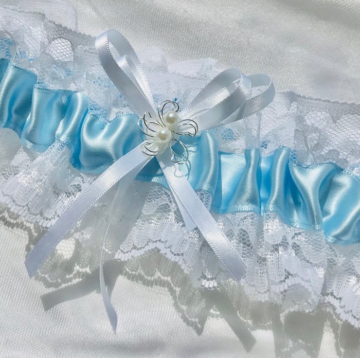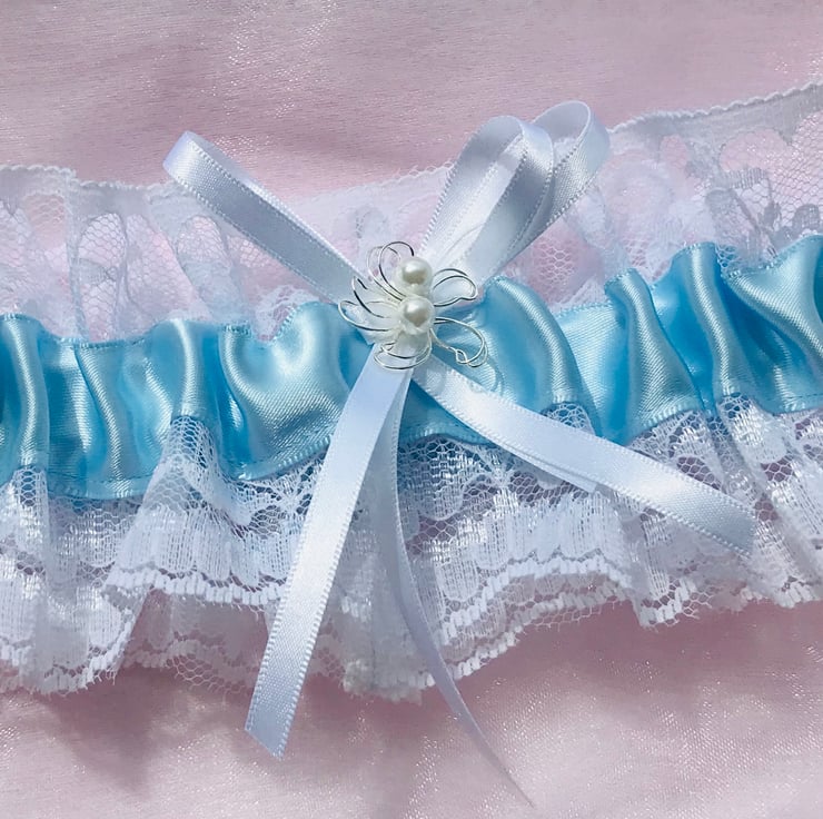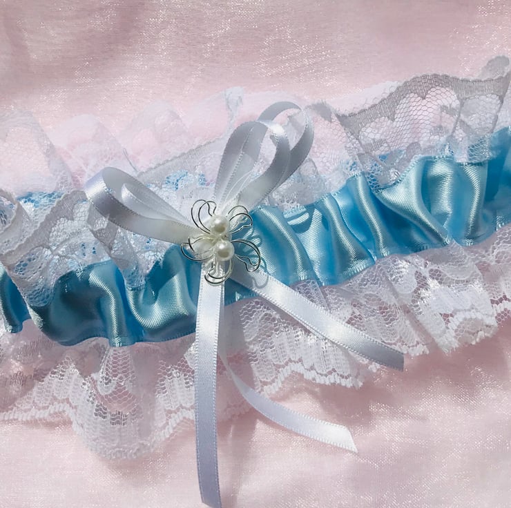 Pretty white and blue Nottingham lace garter, perfect for a summer wedding. Embellished with pale blue satin ribbon, white satin bows, silver coloured metal flower and faux pearls. Approximately 3 inches in depth.